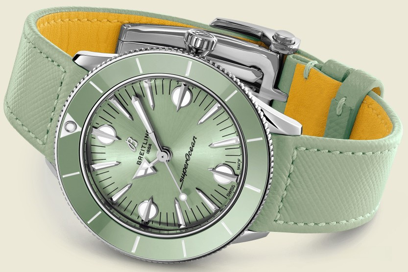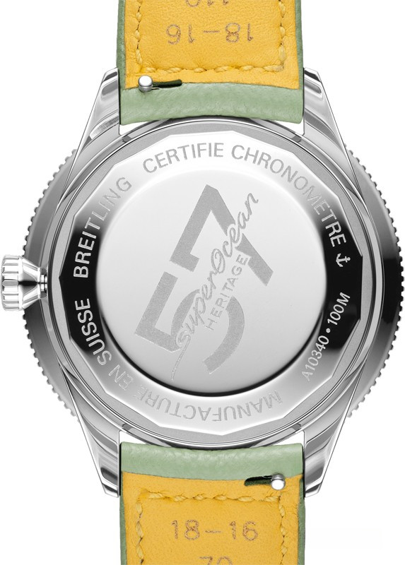 Часы Breitling Superocean Heritage 57 представлены в корпусе из нержавеющей стали размером 38 мм и водонепроницаемостью до 100 метров. Внутри корпуса установлен автоматический механизм, Калибр Breitling 10 с запасом хода 42 часа. На зеленом циферблате отображаются часы, минуты, секунды. Часы комплектуются кожаным ремешком с застежкой из нержавеющей стали.