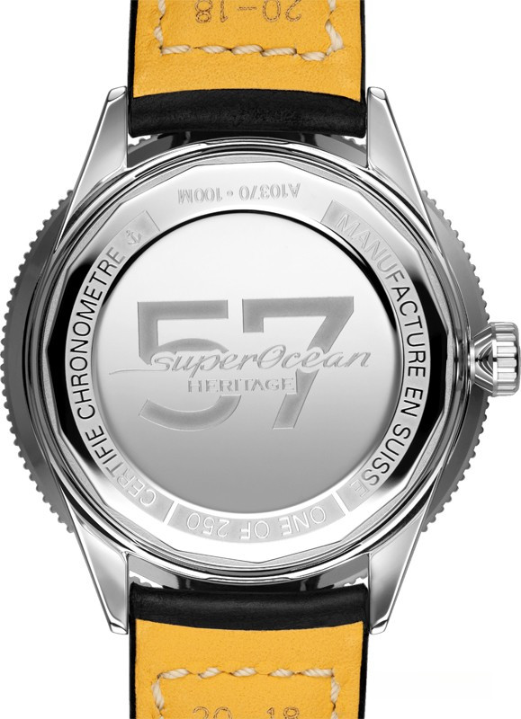 Часы Breitling Superocean Heritage 57 представлены в корпусе из нержавеющей стали размером 42 мм и водонепроницаемостью до 100 метров. Внутри корпуса установлен автоматический механизм, Калибр Breitling 10 с запасом хода 42 часа. На черном циферблате отображаются часы, минуты, секунды. Часы комплектуются кожаным ремешком с вставкой из нержавеющей стали.