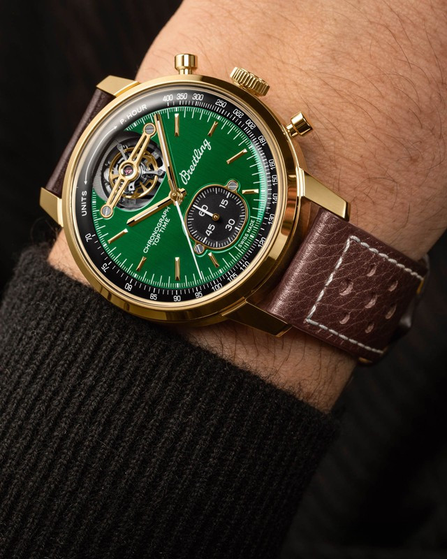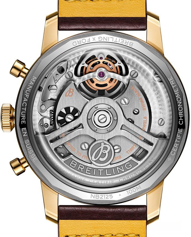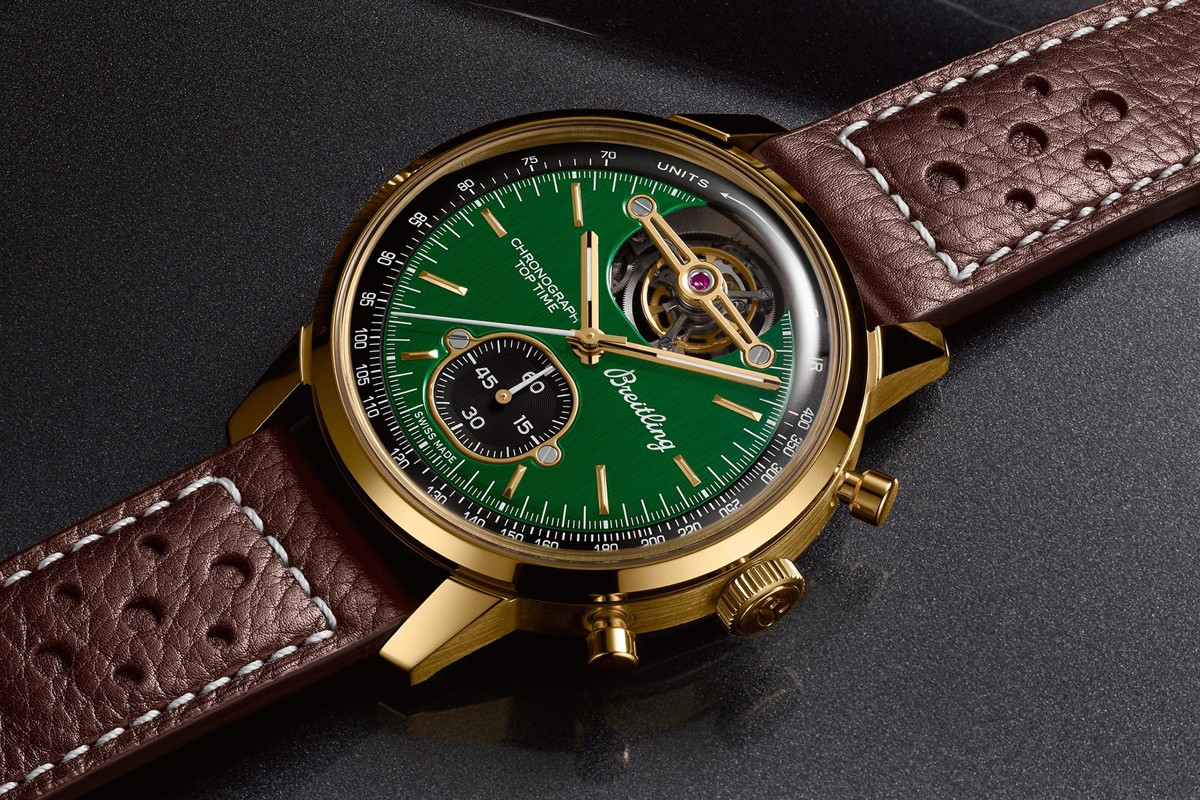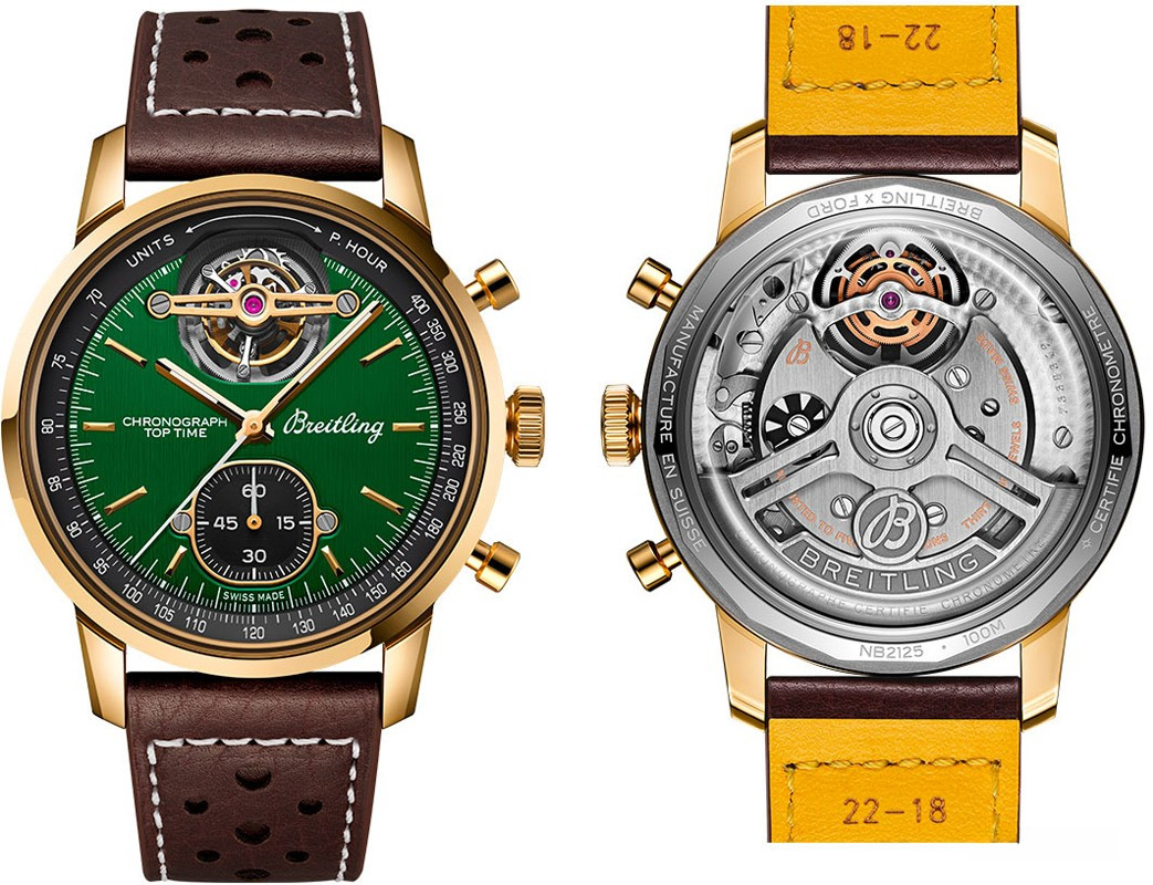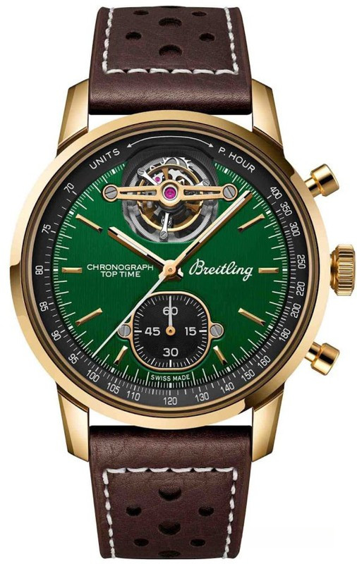 Часы Breitling Top Time American Sports Cars представлены в корпусе размером 43 х 15.4 мм из бронзы водонепроницаемостью 100 метров. Внутри корпуса установлен автоматический механизм, Калибр В21, обладающий запасом хода 55 часов. На зеленом циферблате отображаются часы, минуты, секунды, тахиметр, турбийон. Часы поставляются на кожаном ремешке с бронзовой застежкой.