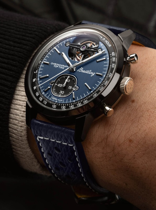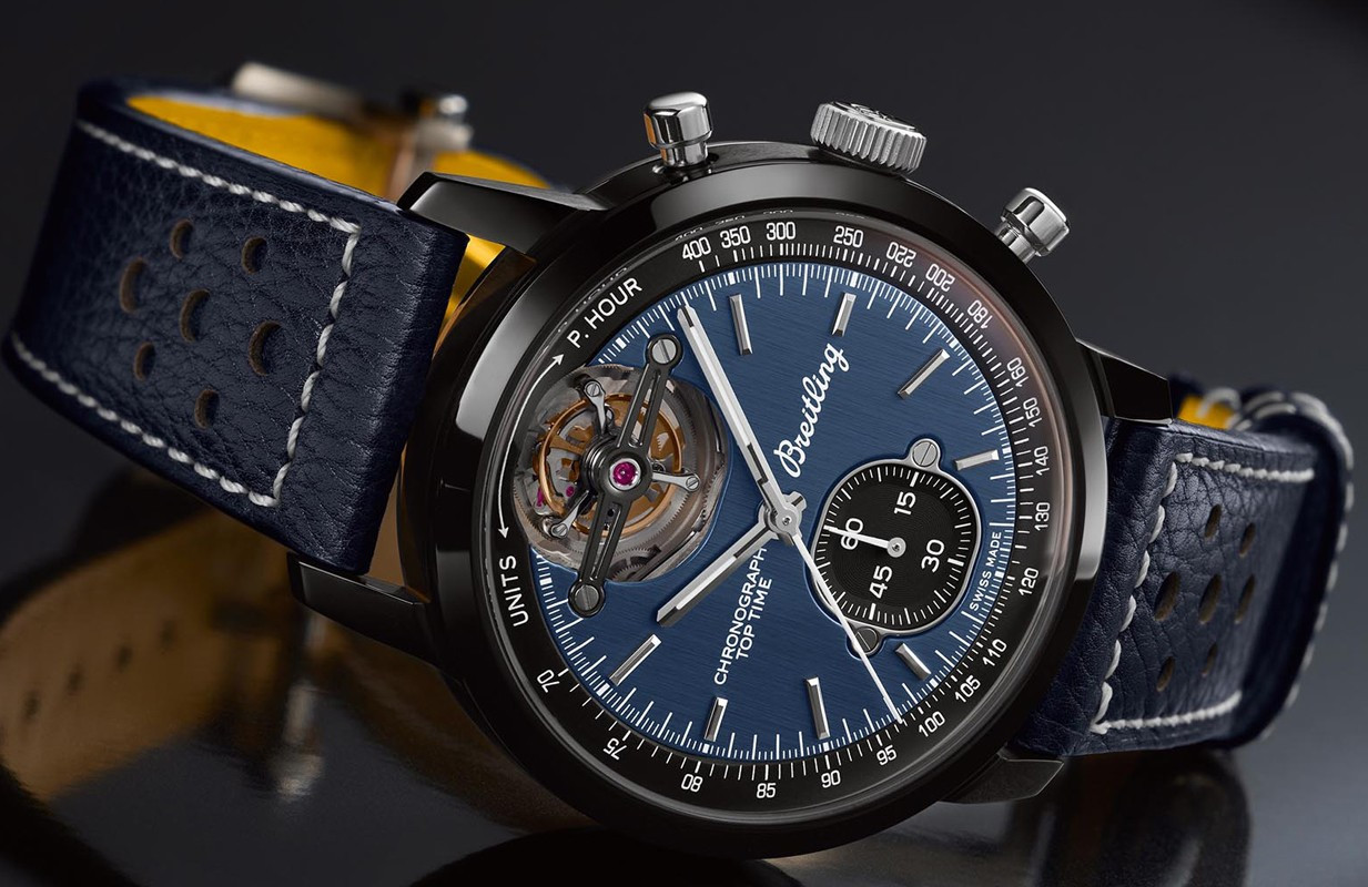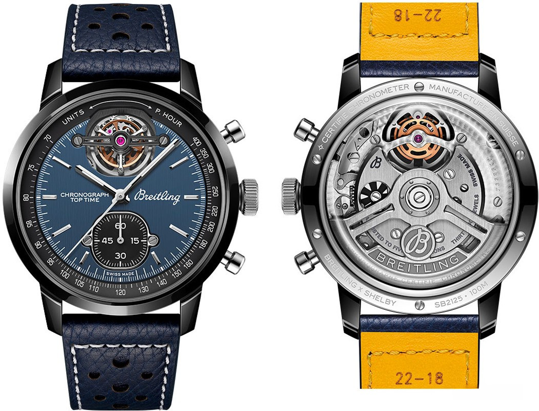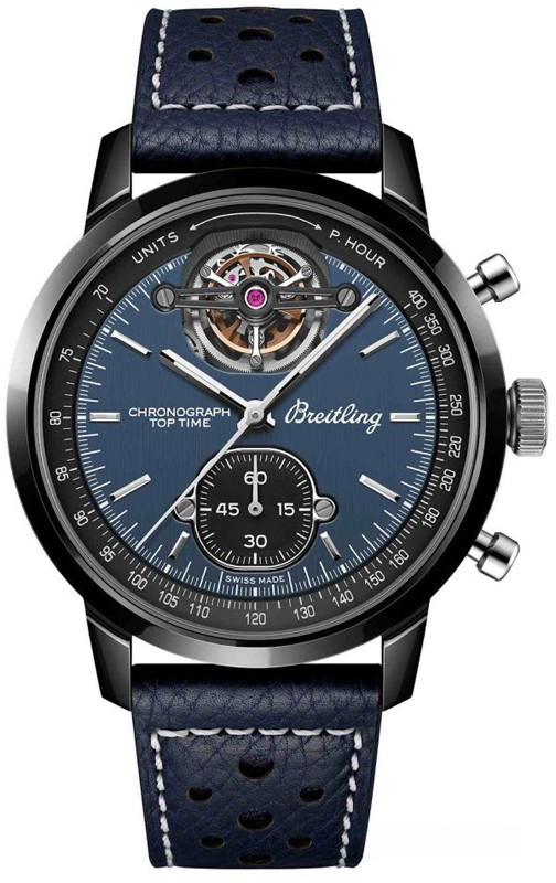 Часы Breitling Top Time American Sports Cars представлены в корпусе размером 44 х 15.4 мм из керамики водонепроницаемостью 100 метров. Внутри корпуса установлен автоматический механизм, Калибр В21, обладающий запасом хода 55 часов. На синем циферблате отображаются часы, минуты, секунды, тахиметр, турбийон. Часы поставляются на кожаном ремешке с керамической застежкой.