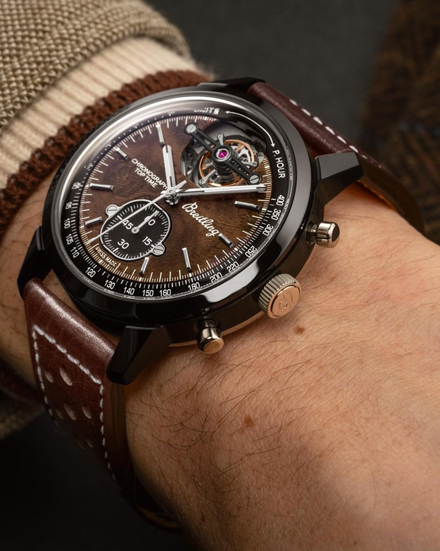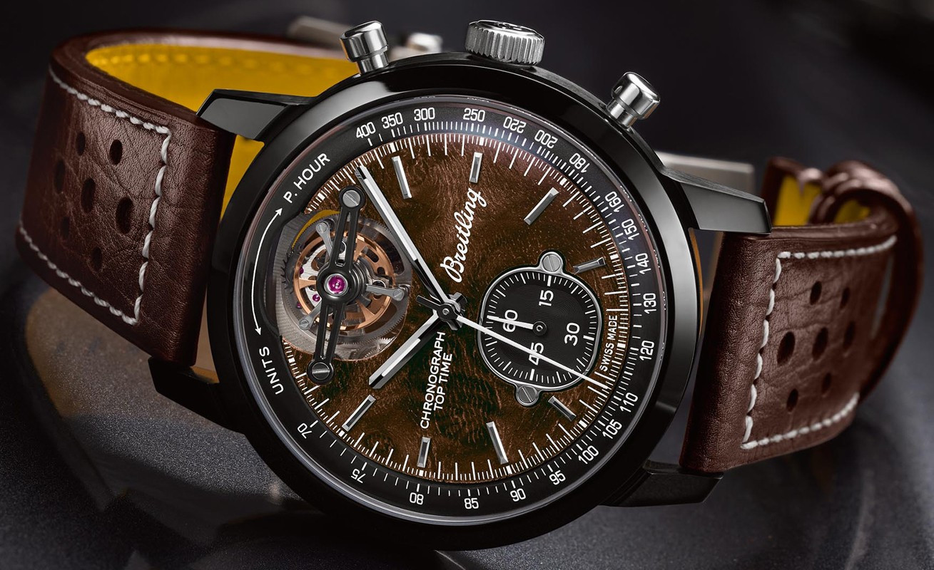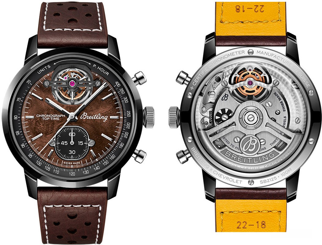 Часы Breitling Top Time American Sports Cars представлены в корпусе размером 44 х 15.4 мм из керамики водонепроницаемостью 100 метров. Внутри корпуса установлен автоматический механизм, Калибр В21, обладающий запасом хода 55 часов. На коричневом циферблате отображаются часы, минуты, секунды, тахиметр, турбийон. Часы поставляются на кожаном ремешке с керамической застежкой.