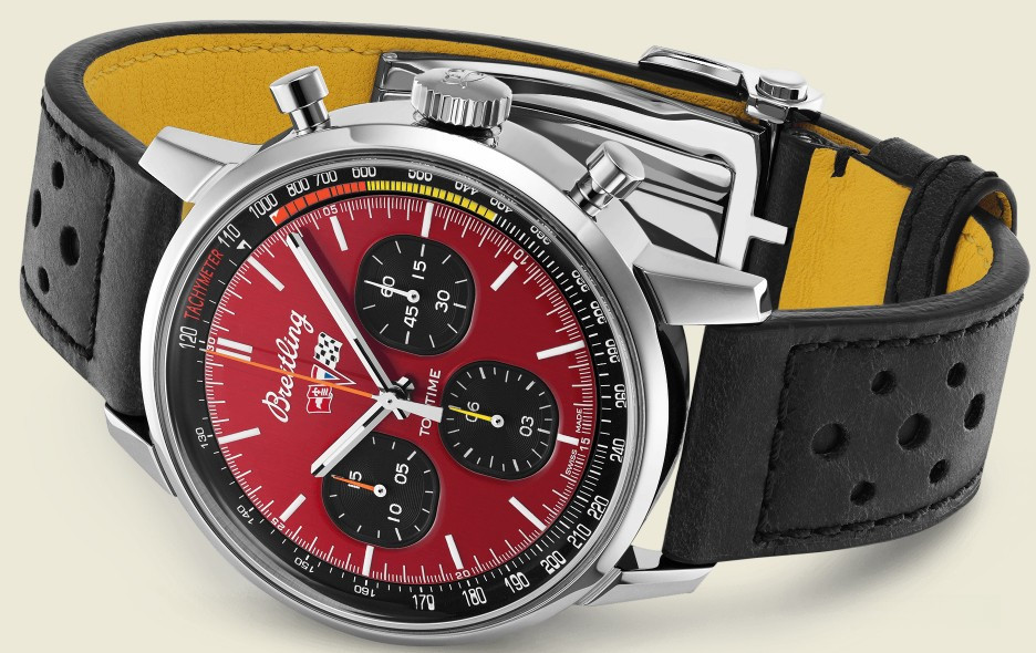 Часы Breitling Top Time Chevrolet Corvette представлены в корпусе размером 42 х 13.6 мм из нержавеющей стали водонепроницаемостью 100 метров. Внутри корпуса установлен автоматический механизм, Калибр Breitling 25, обладающий запасом хода 42 часа. На красном циферблате отображаются часы, минуты, секунды, тахиметр, накопители хронографа. Часы поставляются на кожаном ремешке с застежкой из нержавеющей стали.
