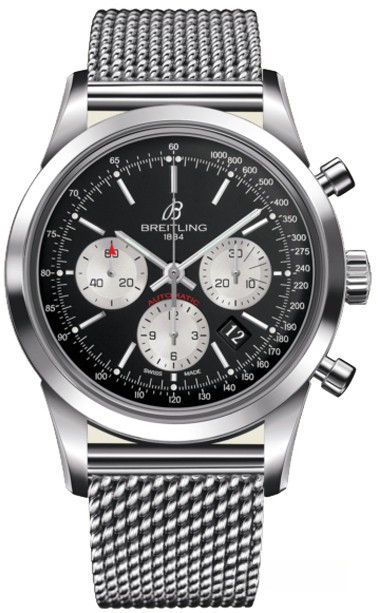 Часы Breitling Transocean Chronograph представлены в корпусе из нержавеющей стали размером 43 х 14.35 мм и водонепроницаемостью до 100 метров. Внутри корпуса установлен автоматический механизм, Калибр Breitling 01 с запасом хода 70 часов. На черном с серебристым циферблате отображаются часы, минуты, секунды, дата, тахиметр, накопители хронографа. Часы комплектуются браслетом из нержавеющей стали.