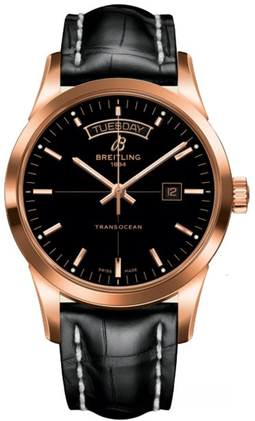 Часы Breitling Transocean Day & Date представлены в корпусе из розового золота 18к размером 43 х 12.8 мм и водонепроницаемостью до 100 метров. Внутри корпуса установлен автоматический механизм, Калибр Breitling 45 с запасом хода 40 часов. На черном циферблате отображаются часы, минуты, секунды, дата, день недели. Часы комплектуются ремешком из кожи аллигатора с вставкой из розового золота 18к.