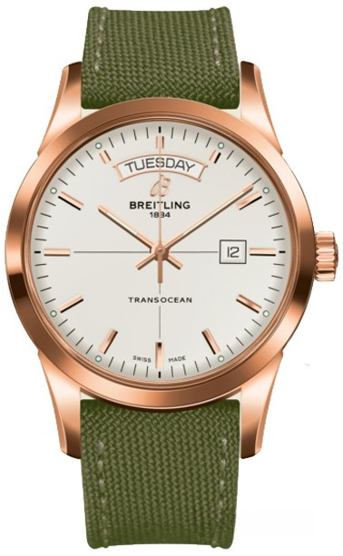 Часы Breitling Transocean Day & Date представлены в корпусе из розового золота 18к размером 43 х 12.8 мм и водонепроницаемостью до 100 метров. Внутри корпуса установлен автоматический механизм, Калибр Breitling 45 с запасом хода 40 часов. На белом циферблате отображаются часы, минуты, секунды, дата, день недели. Часы комплектуются текстильным ремешком с вставкой из розового золота 18к.