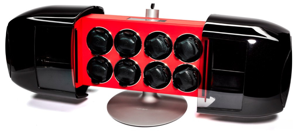 Шкатулки для часов с автоподзаводом Buben & Zorweg Time Mover Phantom 8 для восьми моделей часов. Размер корпуса 280 х 418/738 х 242 мм. Корпус изготовлен из массива белого ясеня с 10-кратным покрытием лаком, карбона, металла. В интерьере применяется красная кожа.