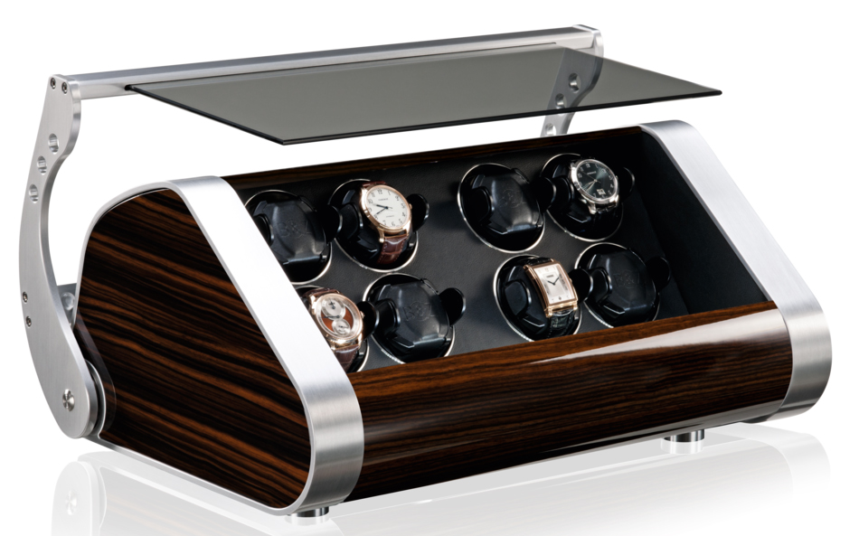 Шкатулка Buben & Zorweg на восемь фирменных часов с автоподзаводом Time Mover Revolution 8 Revolution 8 Macassar. Размер: 260 x 690 x 325 мм. Дизайн и функционал высочайшего уровня: три режима вращения, таймер, режим быстрого подзавода, спящий режим, новейшая система светодиодной подсветки. Механизм плавного закрывания, немецкий замок с секретом, алюминиевый каркас. Высокоглянцевое покрытие рояльным лаком с инкрустацией вставками из ценных пород дерева и внутренней отделкой из высококачественной итальянской кожи наппа. Современная технология светодиодного освещения с функцией затухания. Данная модель - высококачественная ручная работа немецких мастеров. шкатулка работает от сети. Данная часовая шкатулка в полной мере отражает страсть к инновациям. В частности, идею о том, что максимальная прозрачность может комбинироваться с оптимальной защитой: немецкий замок с секретом обеспечивает необходимую защиту от несанкционированного доступа к ценным экземплярам часовой коллекции, расположенным за прозрачным защитным стеклом.