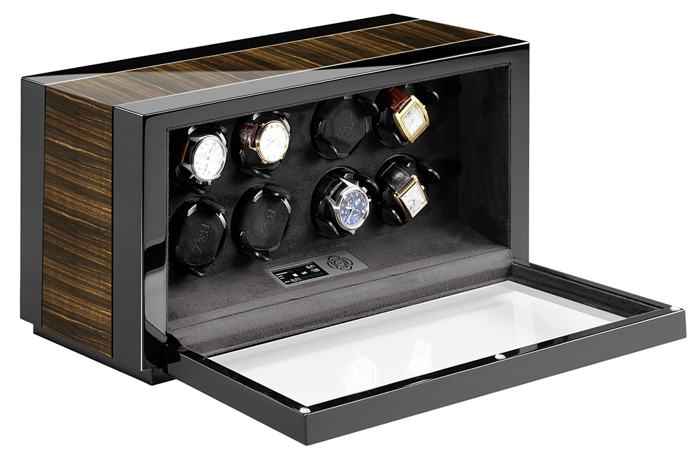 Австрийская компания Buben & Zorweg выпускает шкатулки и футляры для хранения и подзавода часов, украшений и драгоценностей. Уникальные футляры для хранения часов с автоподзаводом Buben & Zorweg, выполненные из вишнёвого дерева, макассара или индийского гранита не только сохранят механизм часов, но и органично впишутся в ваш интерьер. Ценителям чистого функционального стиля понравится шедевр ручной работы, созданный по принципу «форма вытекает из функции» с применением инновационного высокотехнологичного оборудования и высококачественных, тщательно отобранных материалов. Уникальная ценность Vantage раскрывается с первого взгляда, первого прикосновения независимо от того, использовались ли для ее отделки карбон или макассар. Многослойное (10) высокоглянцевое лаковое покрытие отражает свет, темный велюр подчеркивает впечатляющую коллекцию часов под прозрачным защитным хрустальным стеклом автоматического подзаводчика TIME MOVER®. Шкатулка для восьми часов Time Mover Vantage 8, с автоподзаводом. Внешняя отделка: массив дерева под черным глянцевым лаком, с вставками из дерева маккасар. Многослойное нанесение рояльного лака дает очень глубокий и насыщенный цвет дерева и предотвращает от старения и выцветания. Внутренняя отделка: черный велюр, кожа. Размеры: 455х244х244. Вес: 12кг. Комплектуется сетевым адаптером.