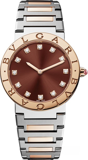 Часы Bvlgari Bvlgari Quartz 33 mm представлены в корпусе из нержавеющей стали и розового золота 18к диаметром 33 мм водонепроницаемостью 30 метров. Внутри корпуса установлен кварцевый механизм. На коричневом циферблате с 12-ю белыми бриллиантами отображаются часы, минуты. Часы комплектуются браслетом из нержавеющей стали и розового золота 18к.