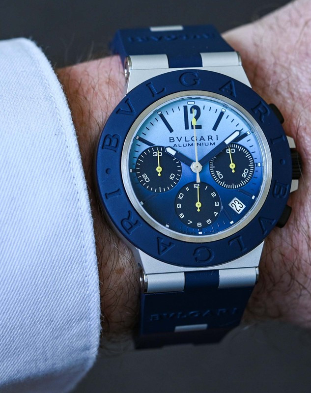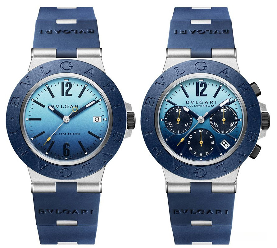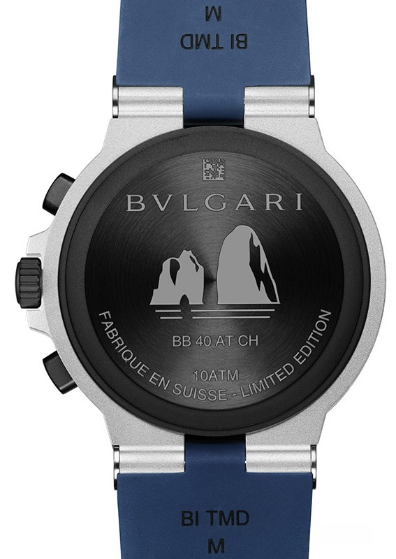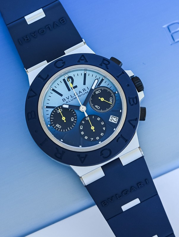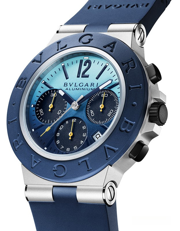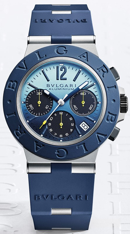 Часы Bvlgari Aluminium Capri Chronograph представлены в корпусе размером 40 мм из алюминия с каучуковым безелем водонепроницаемостью 100 метров. Внутри корпуса установлен автоматический механизм, Калибр В130, обладающий запасом хода 42 часа. На голубом циферблате отображаются часы, минуты, секунды, дата, накопители хронографа. Часы поставляются на каучуковом ремешке с застежкой из нержавеющей стали. Серия ограничена - 1000 шт.