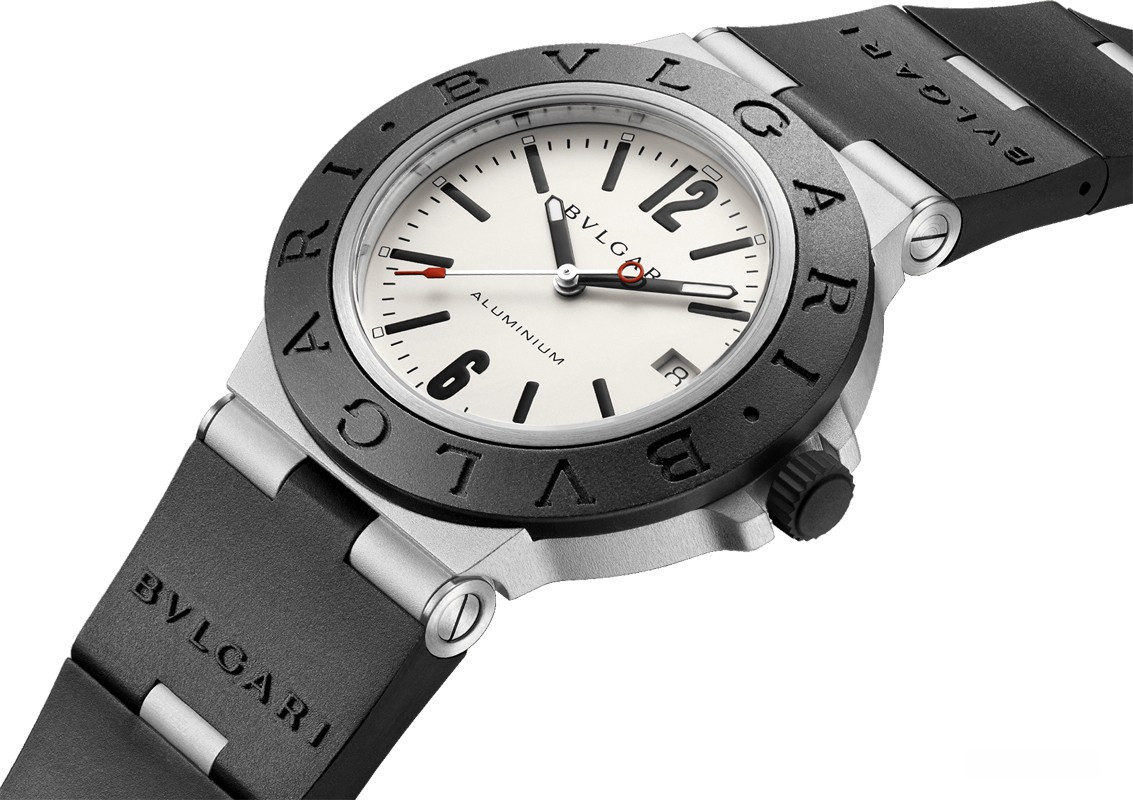 Часы Bulgari Aluminium комплектуются белым циферблатом, они имеет узнаваемую надпись Bulgari Bulgari вокруг безеля, а также характерный для бренда дизайн. Модель обладает 40-миллиметровым корпусом из алюминия и титана, а также механическим Калибром BVL 191 от Bulgari. На циферблате отображаются часы, минуты, секунды и дата. Апертура даты находится на 3-х часах. Часы комплектуются каучуковым ремешком с вставкой из нержавеющей стали.