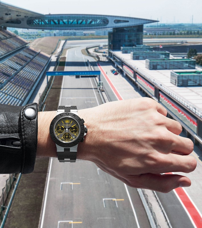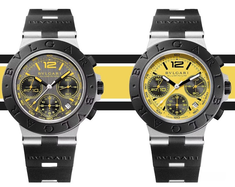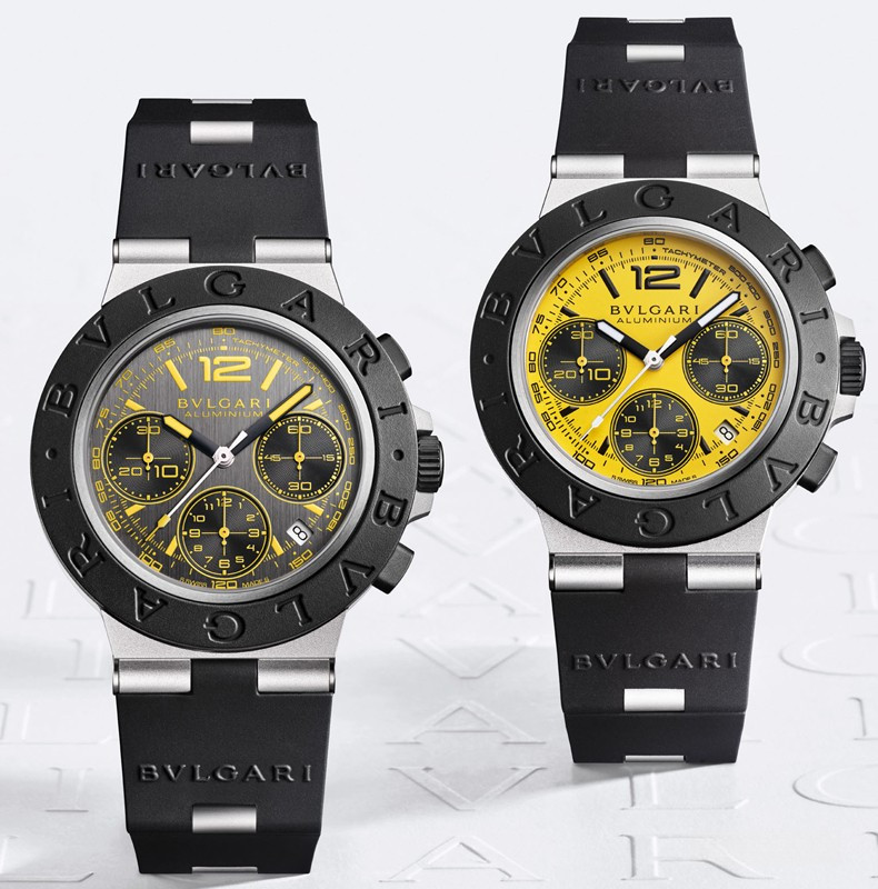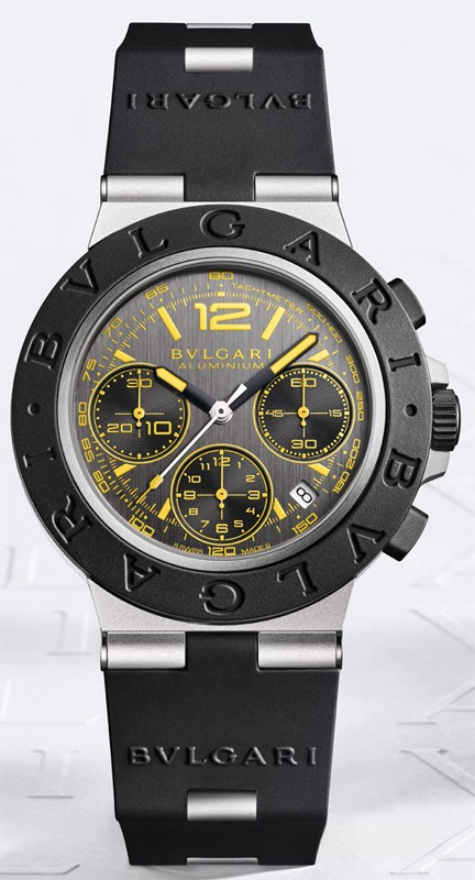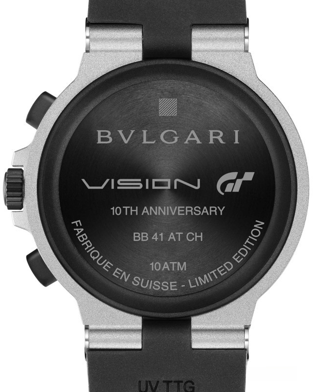 Часы Bvlgari Gran Turismo представлены в корпусе размером 41 х 11.1 мм из алюминия водонепроницаемостью 100 метров. Внутри корпуса установлен автоматический механизм, Калибр В381, обладающий запасом хода 42 часа. На сером циферблате отображаются часы, минуты, секунды, дата, тахиметр. Часы поставляются на каучуковом ремешке с застежкой из алюминия. Серия ограничена - 1200 шт.