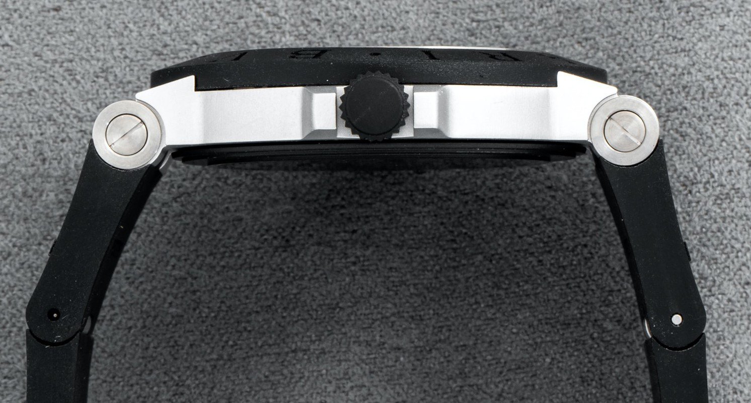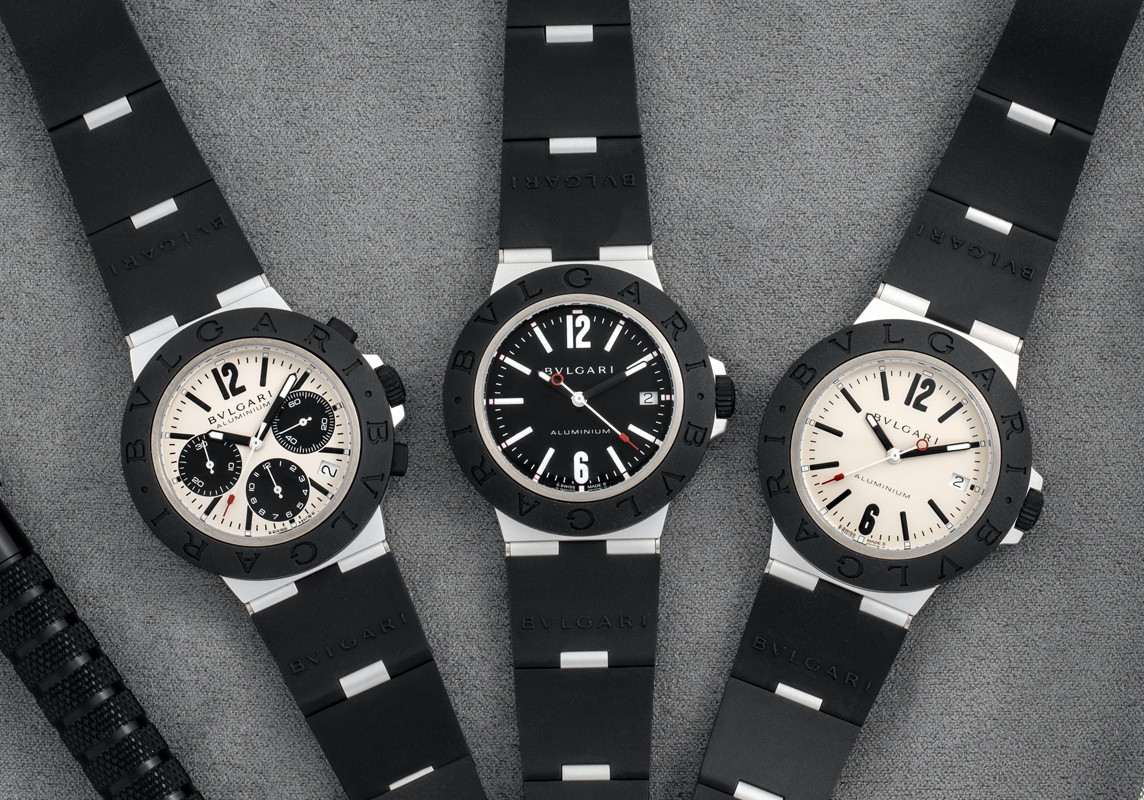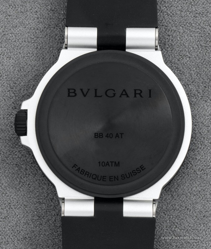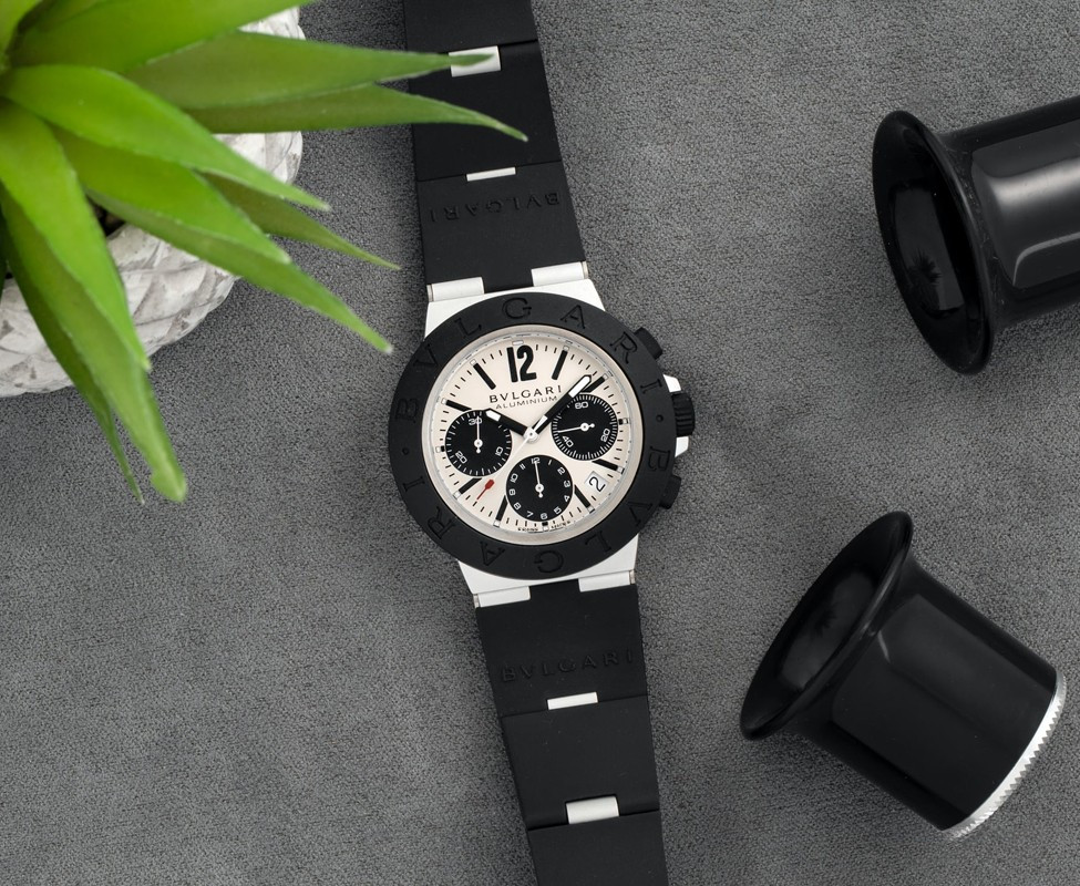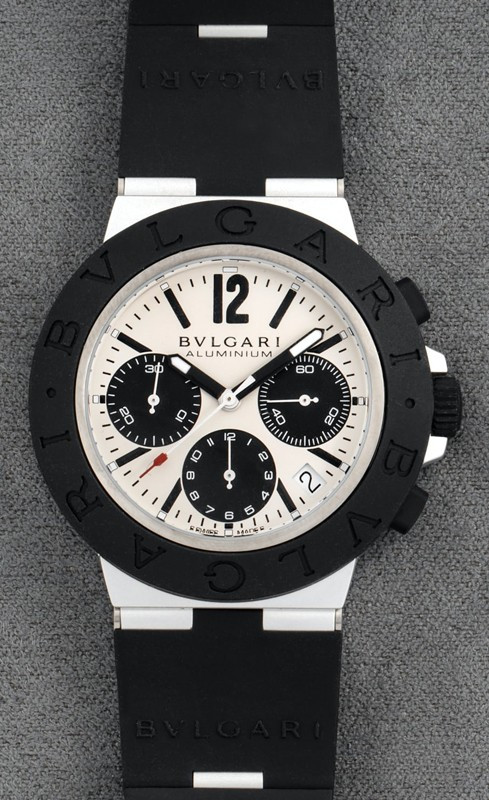 Часы Bulgari Aluminium Chronograph представлены в корпусе из титана и алюминия с покрытием DLC размером 40 мм воднепроницаемостью 100 метров. Внутри корпуса установлен автоматический механизм, Калибр B130, обладающий запасом хода 42 часа. На белом с черным циферблате отображаются часы, минуты, секунды, дата. Часы поставляются на браслете из алюминия и каучука.