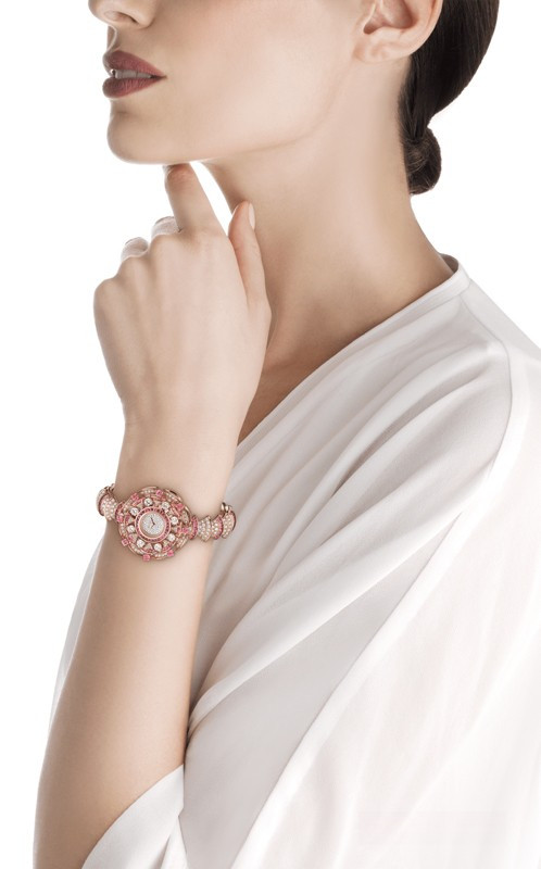 водонепроницаемость 30 м, корпус инкрустирован белыми бриллиантами, розовыми рубеллитами