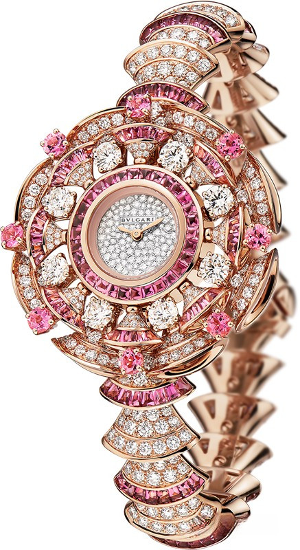 Часы Bvlgari Diva представлены в корпусе из розового золота 18к размером 39 мм и водонепроницаемостью 30 метров. Внутри корпуса установлен кварцевый механизм. На циферблате из белых бриллиантов отображаются часы, минуты. Часы поставляются на браслете из розового золота 18к с белыми бриллиантами, розовыми рубеллитами. Корпус инкрустирован белыми бриллиантами, розовыми рубеллитами.