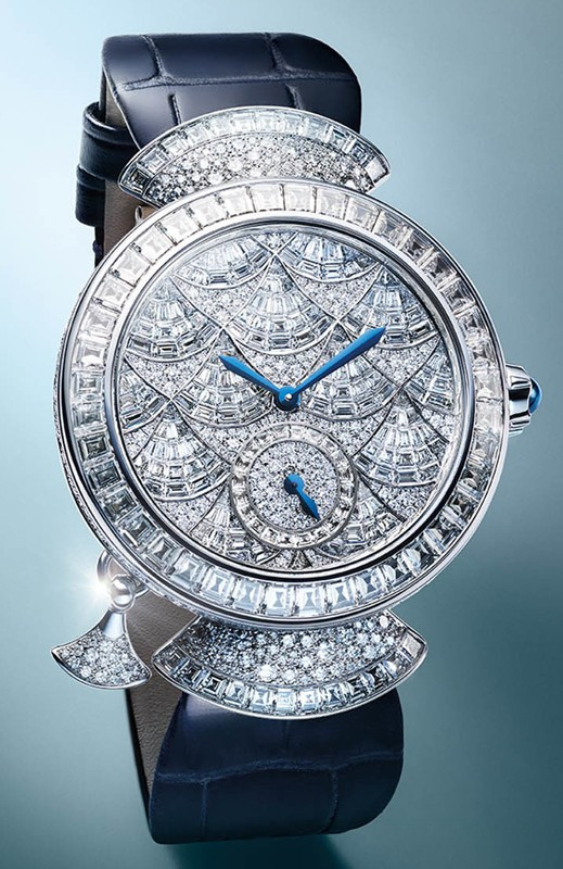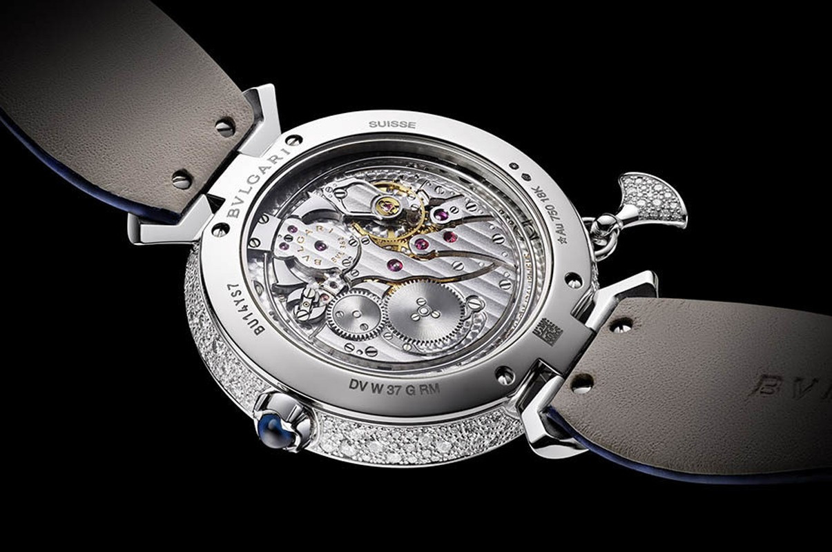 Часы Bvlgari Diva's Dream Finissima Mosaica с репетиром представлены в корпусе из белого золота 18к диаметром 37 мм водонепроницаемостью 30 метров. Внутри корпуса установлен механизм с ручным заводом, Калибр BVL 362, обладающий запасом хода 42 часа. На циферблате с белыми бриллиантами отображаются часы, минуты, секунды. Часы поставляются на ремешке из кожи аллигатора с вставкой из белого золото 18к. Корпус инкрустирован белыми бриллиантами.