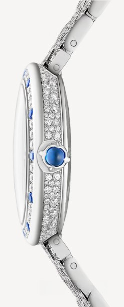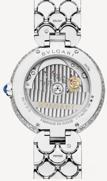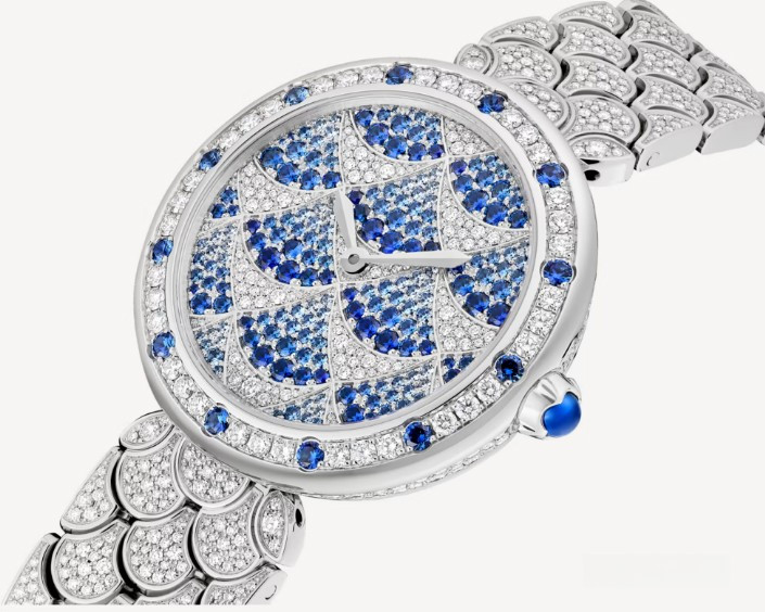 Часы Bvlgari Diva's Dream Mosaica представлены в корпусе из белого золота 18к диаметром 37 мм водонепроницаемостью 30 метров. Внутри корпуса установлен автоматический механизм, Калибр BVL191, обладающий запасом хода 42 часа. На циферблате с белыми бриллиантами и синими сапфирами отображаются часы, минуты. Часы поставляются на браслете из белого золото 18к, инкрустированном белыми бриллиантами. Корпус инкрустирован белыми бриллиантами.