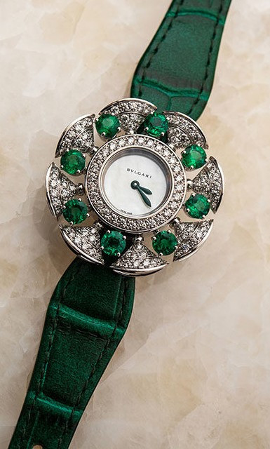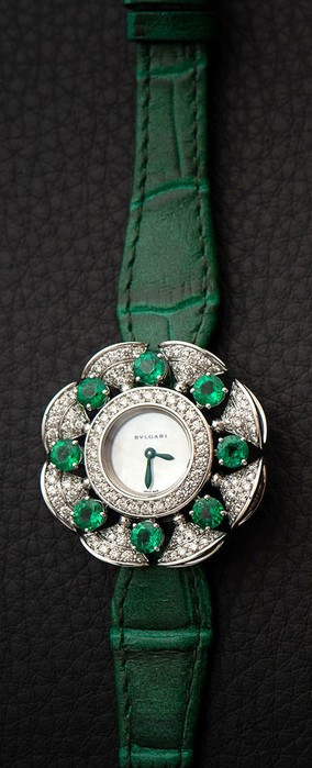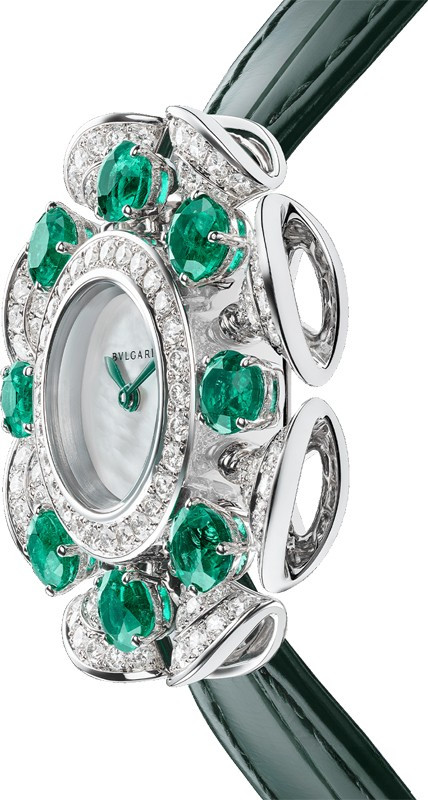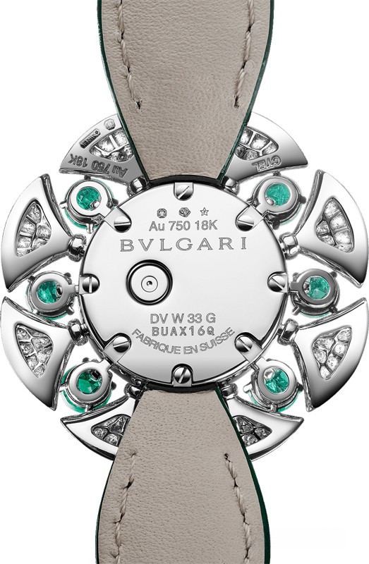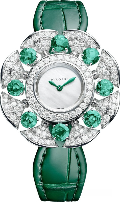 Часы Bvlgari Diva's Dream представлены в корпусе из белого золота 18к размером 33 мм и водонепроницаемостью 30 метров. Внутри корпуса установлен кварцевый механизм. На белом жемчужном циферблате отображаются часы, минуты. Часы поставляются на ремешке из кожи аллигатора с вставкой из белого золота 18к. Корпус инкрустирован белыми бриллиантами и зелеными изумрудами.