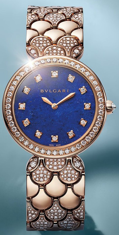 Часы Bvlgari Diva's Dream представлены в корпусе из розового золота 18к размером 33 мм и водонепроницаемостью 30 метров. Внутри корпуса установлен кварцевый механизм. На синем лазуритовом циферблате с 12-ю белыми бриллиантами отображаются часы, минуты. Часы поставляются на браслете из розового золота 18к, инкрустированного белыми бриллиантами. Корпус инкрустирован белыми бриллиантами.