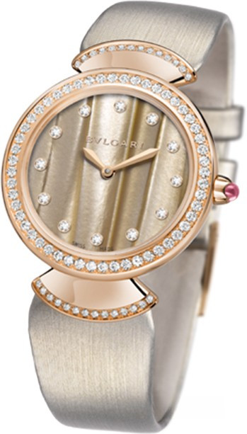 Часы Bvlgari Diva's Dream представлены в корпусе из розового золота 18к размером 30 мм и водонепроницаемостью 30 метров. Внутри корпуса установлен кварцевый механизм. На циферблате из натурального бежевого ацетата с 12-ю белыми бриллиантами отображаются часы, минуты. Часы поставляются на сатиновом ремешке с вставкой из розового золота 18к. Корпус инкрустирован белыми бриллиантами.