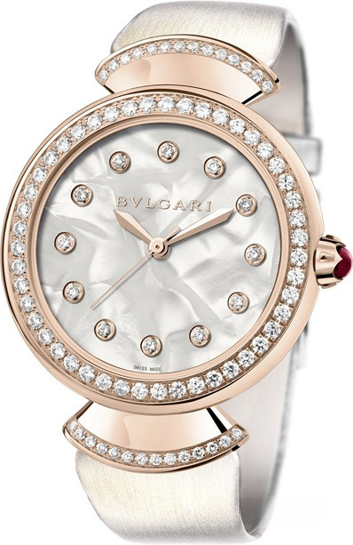 Часы Bvlgari Diva's Dream представлены в корпусе из розового золота 18к размером 37 мм и водонепроницаемостью 30 метров. Внутри корпуса установлен автоматический механизм. На белом жемчужном циферблате с 12-ю белыми бриллиантами отображаются часы, минуты, секунды. Часы поставляются на сатиновом ремешке с вставкой из розового золота 18к. Корпус инкрустирован белыми бриллиантами.