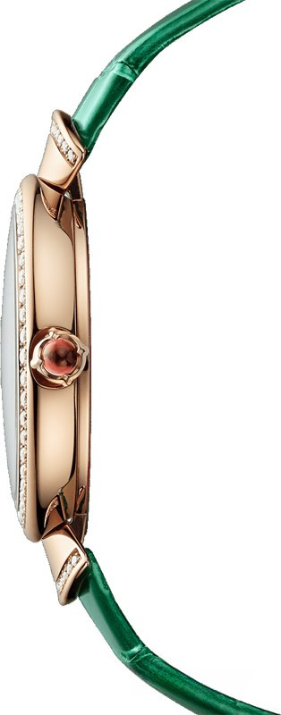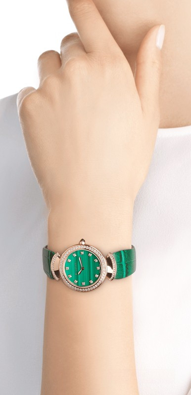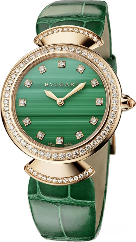 Часы Bvlgari Diva's Dream представлены в корпусе из розового золота 18к размером 30 мм и водонепроницаемостью 30 метров. Внутри корпуса установлен кварцевый механизм. На циферблате из зеленого малахита с 12-ю белыми бриллиантами отображаются часы, минуты. Часы поставляются на ремешке из кожи аллигатора с вставкой из розового золота 18к. Корпус инкрустирован белыми бриллиантами.