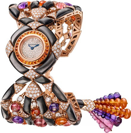 Часы Bvlgari Gemma представлены в корпусе из розового золота 18к диаметром 30 мм и водонепроницаемостью 30 метров. Внутри корпуса установлен кварцевый механизм. На циферблате из белых бриллиантов отображаются часы и минуты. Часы поставляются на браслете из розового золота 18к, инкрустированным белыми бриллиантами, спессаритами, турмалинами, аметистами и черным перламутром. Корпус инкрустирован белыми бриллиантами, спессаритами и черным перламутром.