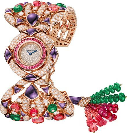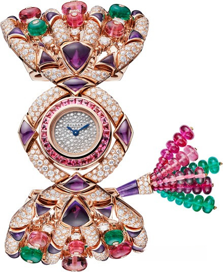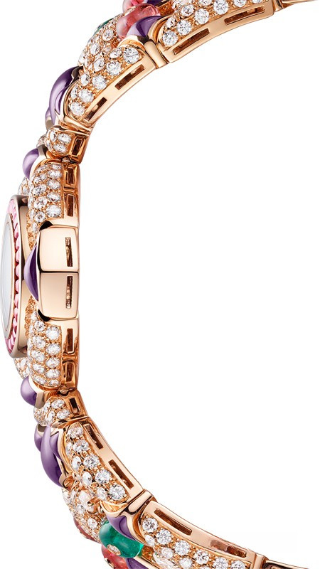 Часы Bvlgari Gemma представлены в корпусе из розового золота 18к диаметром 30 мм и водонепроницаемостью 30 метров. Внутри корпуса установлен кварцевый механизм. На циферблате из белых бриллиантов отображаются часы и минуты. Часы поставляются на браслете из розового золота 18к, инкрустированным белыми бриллиантами, аметистами, турмалинами, рубеллитами, изумрудами. Корпус инкрустирован белыми бриллиантами, турмалинами и аметистами.