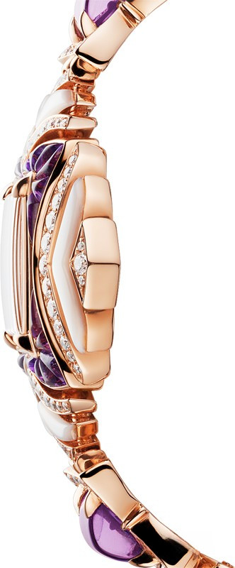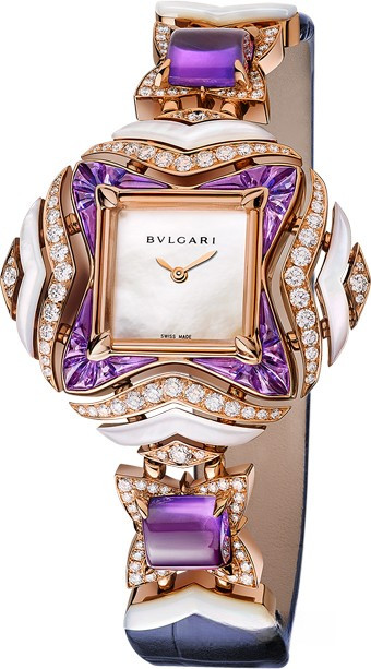 Часы Bvlgari MVSA представлены в корпусе из розового золота 18к диаметром 37 мм и водонепроницаемостью 30 метров. Внутри корпуса установлен кварцевый механизм. На белом жемчужном циферблате отображаются часы и минуты. Часы поставляются на браслете из розового золота 18к, инкрустированном белыми бриллиантами. Корпус инкрустирован белыми бриллиантами, аметистами, перламутром.