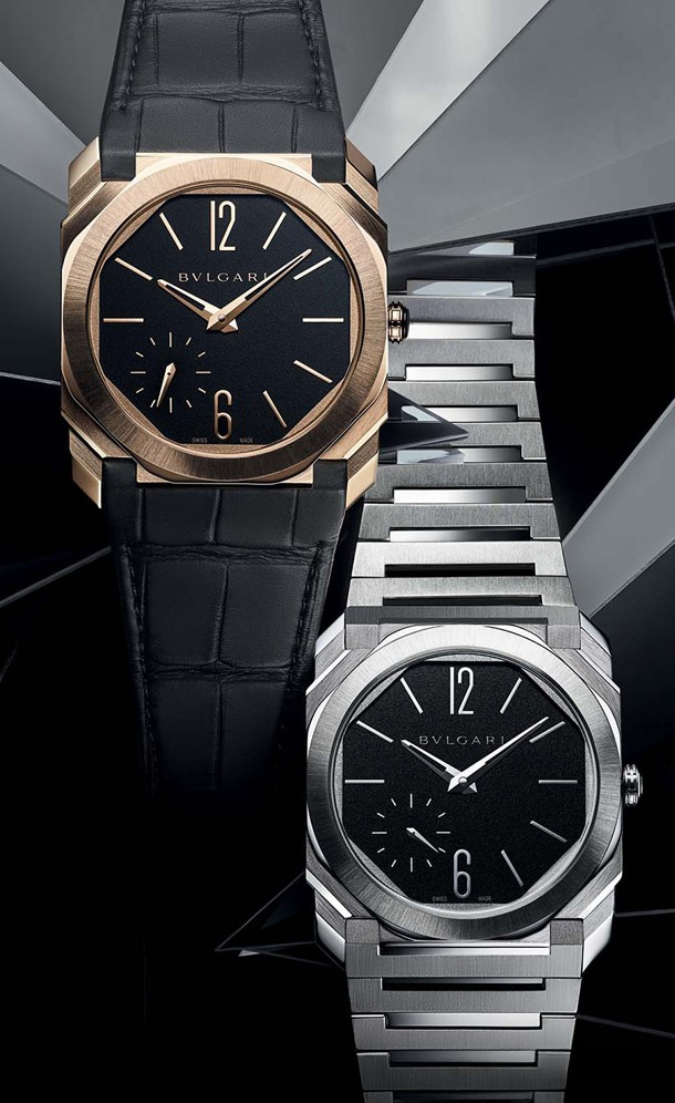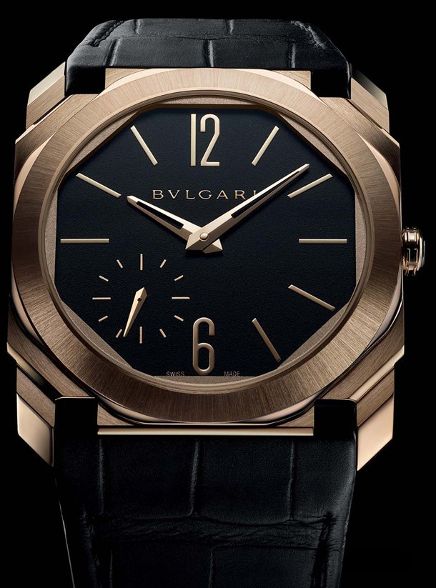 Часовая мануфактура Bulgari представила новую модель часов Octo Finissimo Automatic. Новое творение итальянского дома моды обладает общей толщиной всего 5.25 мм, а его механизм - всего 2.23 мм для диаметра 40 мм. Рабочая частота механизма составляет 21 600 пк/час, механизм обладает 60-часовым запасом хода. Часы водонепроницаемы до 50 метров. Калибр украшен вручную узором Côtes de Genève и круговым зернением. Корпус изготовлен из розового золота 18к. Отдельные поверхности шлифованы пескоструем, что придает часам современные нотки. Часы комплектуются ремешком из кожи аллигатора с вставкой из розового золота 18к.