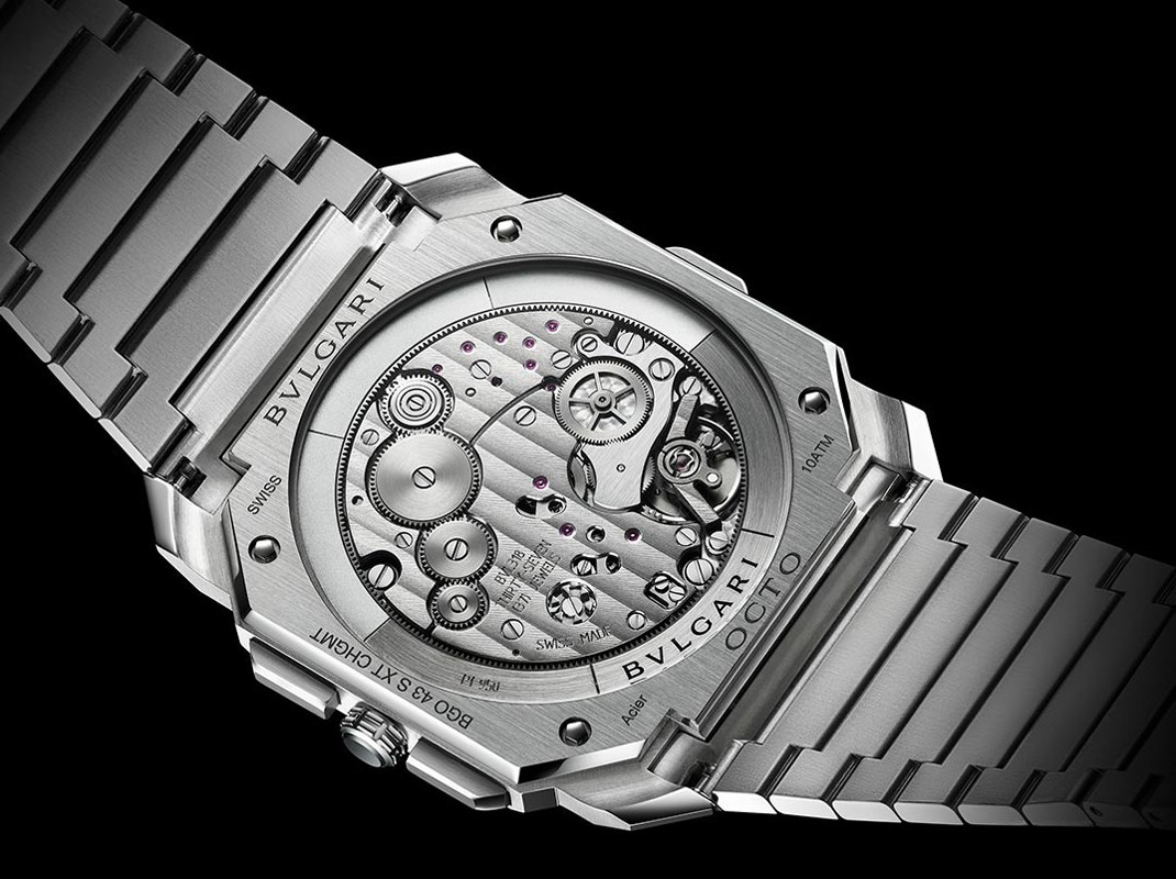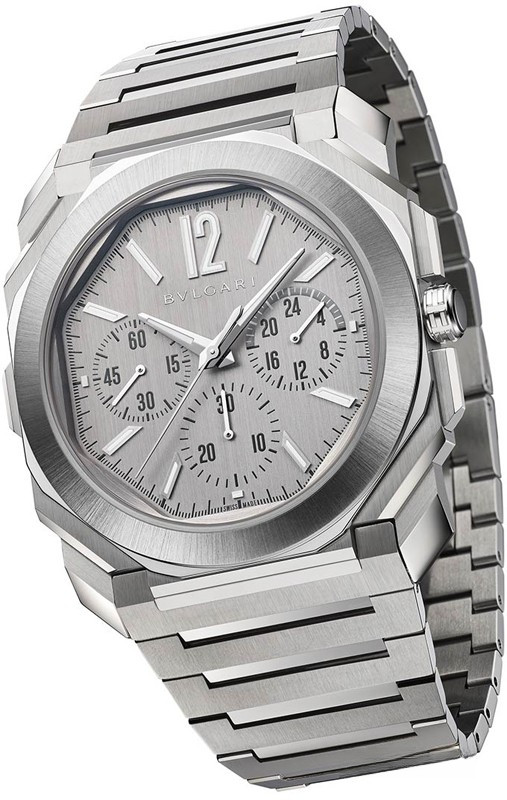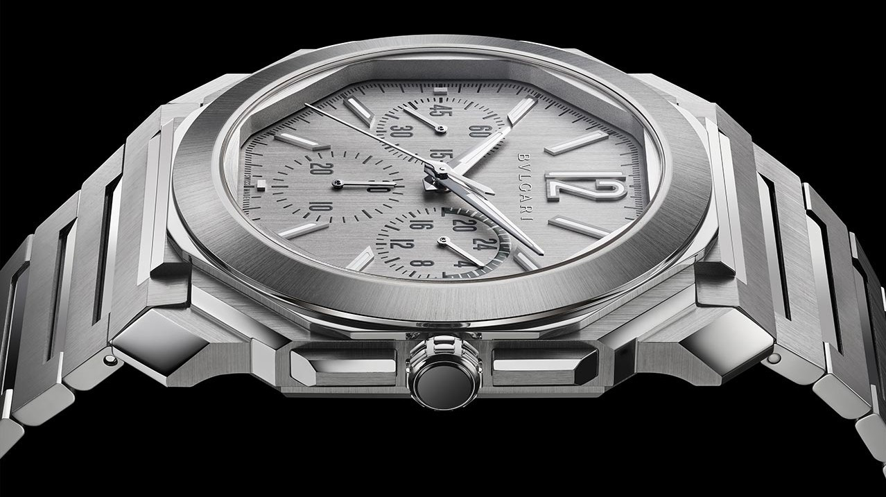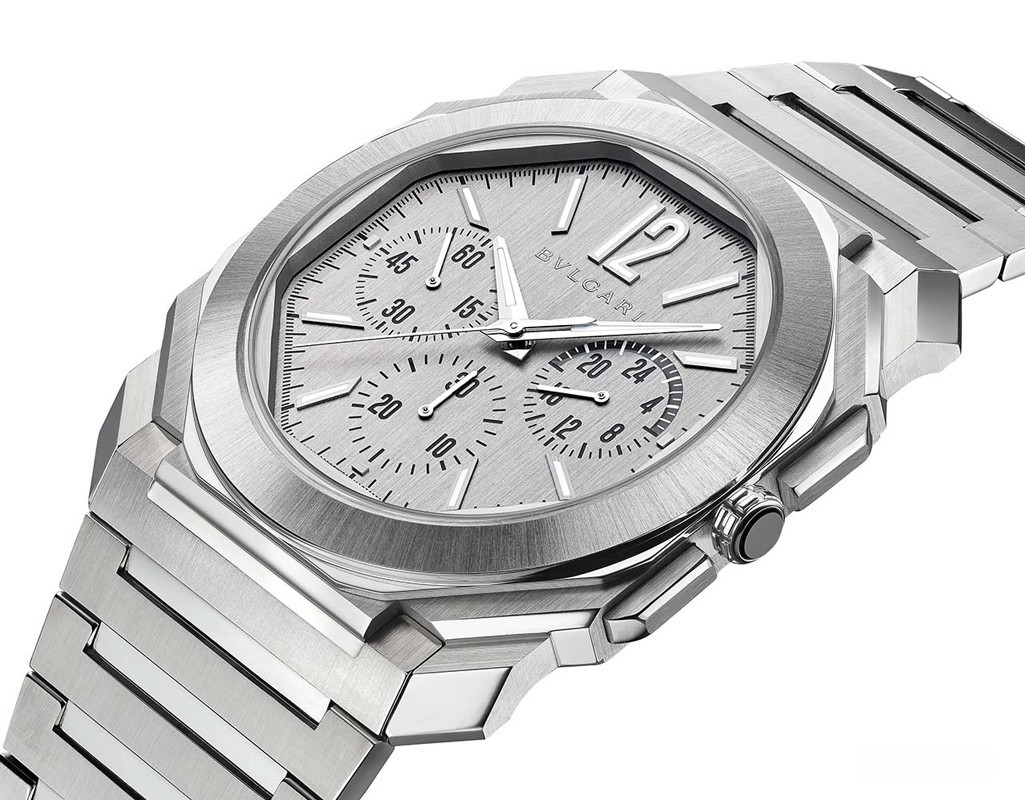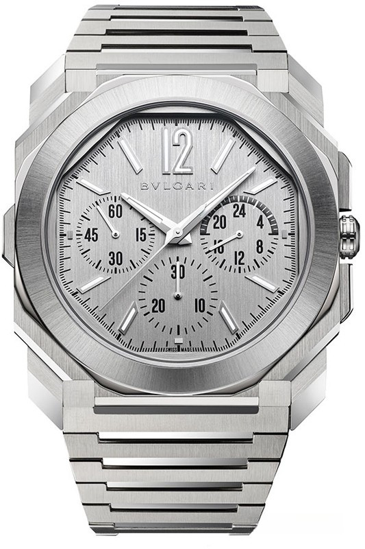 Компания Bulgari представила новую модель часов Octo Finissimo Chronograph GMT Automatic. Новинка с функцией GMT с гордостью может претендовать на звание самого тонкого в мире автоматического хронографа. Толщина корпуса составляет всего 8.75 мм. Как и у многих предыдущих моделей Octo Finissimo, у Octo Finissimo Chronograph GMT Automatic есть угловатый корпус, изготовленный из нержавеющей стали и стальным браслетом. Его диаметр составляет 43 мм. Увеличенные накопители хронографа отличаются минимумом разметки. В центре всего находится совершенно новый механизм, Калибр BVL 318. Механизм имеет толщину всего 3.3 мм, устанавливая еще один рекорд: это самый тонкий автоматический Калибр хронографа из когда-либо сделанных. К тому же он усложнен функцией GMT. Внимательный наблюдатель заметит, что в часах нет традиционного ротора. Чтобы сделать механизм таким тонким, Bulgari пришлось использовать периферийный ротор из твердой платины, что повлекло увеличение диаметра корпуса. Калибр BVL 318 обладает 55-часовым запасом хода. Сменить часовой пояс можно на ходу, всего лишь нажав на кнопку, расположенную на 9-ти часах с боковой стороны корпуса.