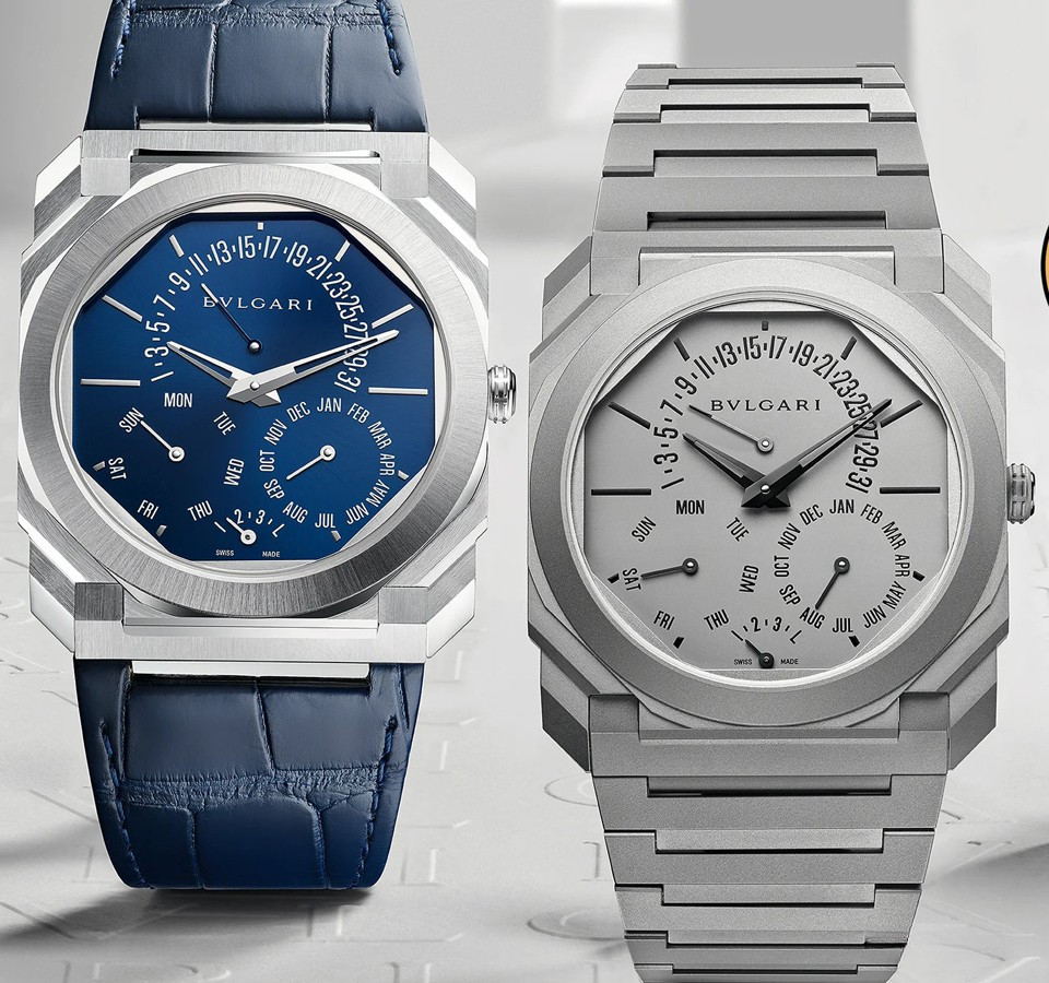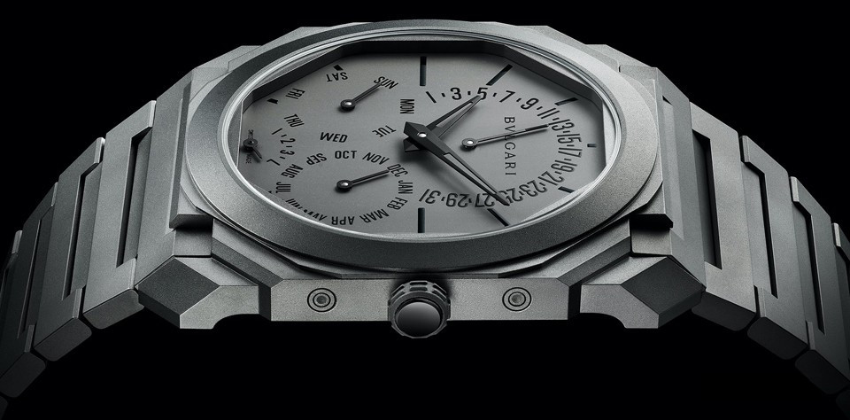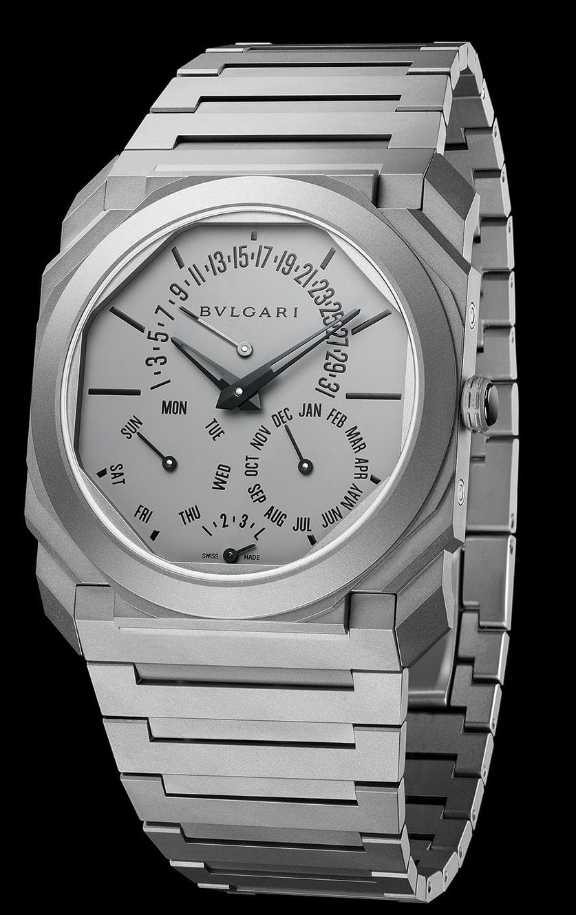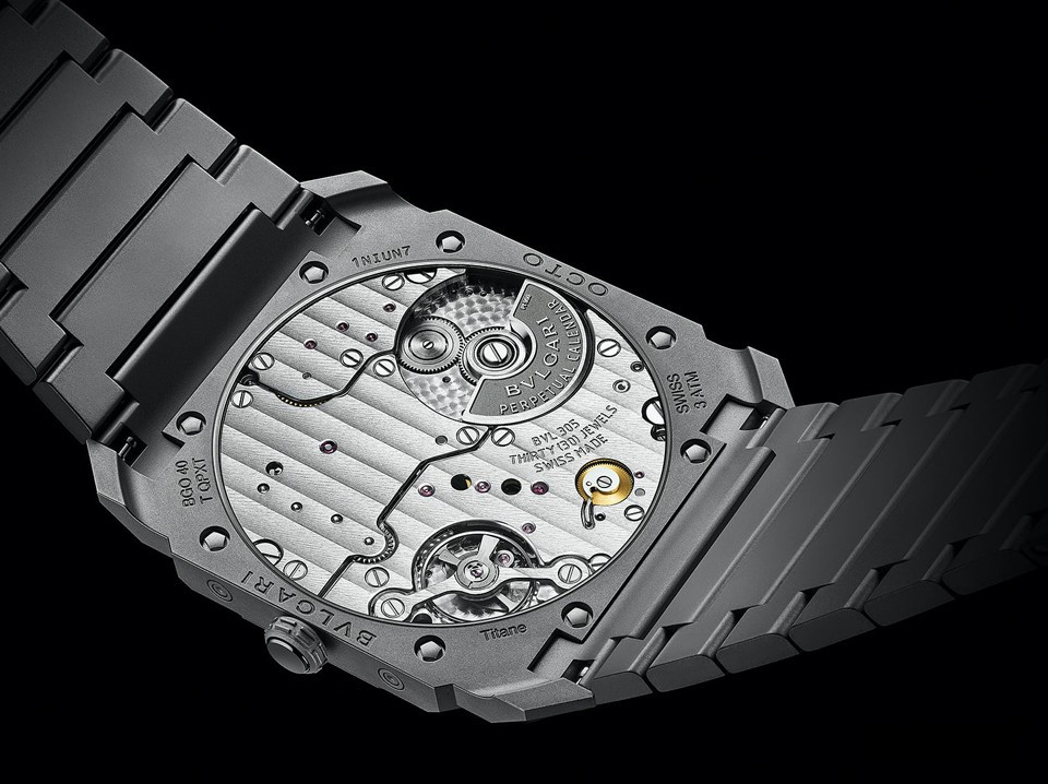 Часы Bvlgari Octo Finissimo Perpetual Calendar представлены в корпусе из титана размером 40 х 5.8 мм водонепроницаемостью 30 метров. Внутри корпуса находится автоматический механизм, Калибр BVL 305, обладающий запасом хода 60 часов. На серебристом циферблате отображаются часы, минуты, дата, день недели, месяц, цикл високосного года. Часы поставляются на титановом браслете.