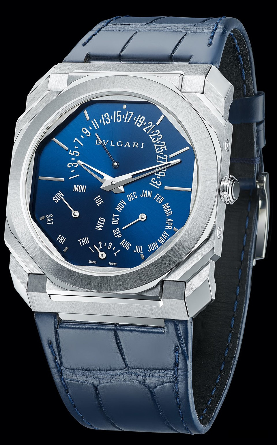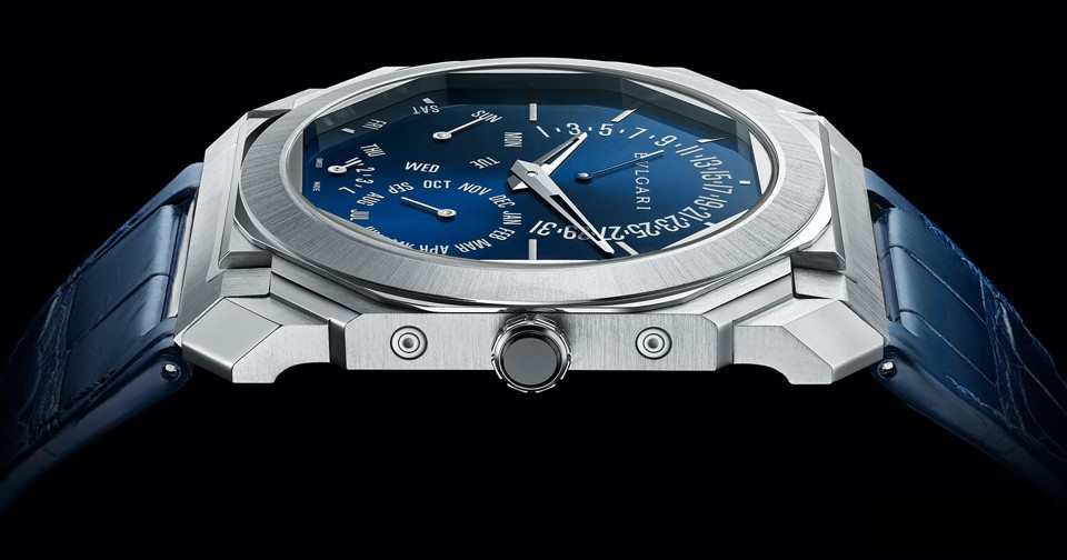 Часы Bvlgari Octo Finissimo Perpetual Calendar представлены в корпусе из платины 950 размером 40 х 5.8 мм водонепроницаемостью 30 метров. Внутри корпуса находится автоматический механизм, Калибр BVL 305, обладающий запасом хода 60 часов. На синем циферблате отображаются часы, минуты, дата, день недели, месяц, цикл високосного года. Часы поставляются на ремешке из кожи аллигатора с платиновой вставкой.