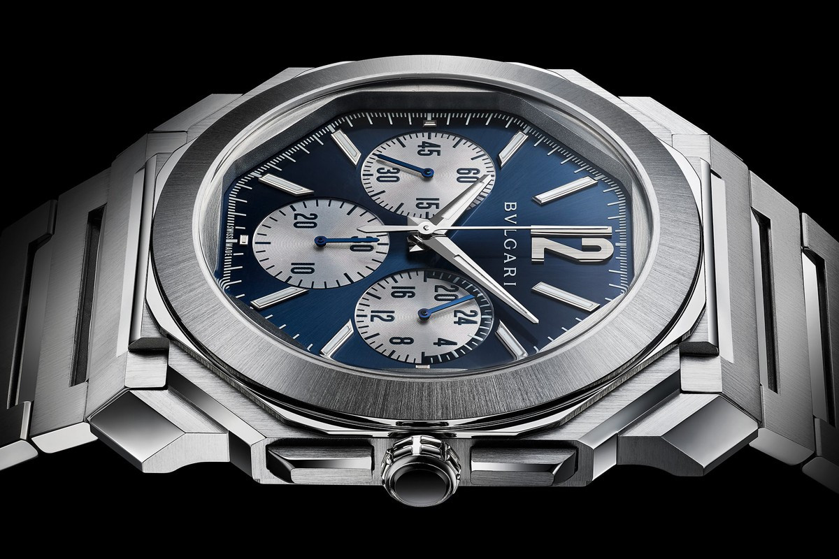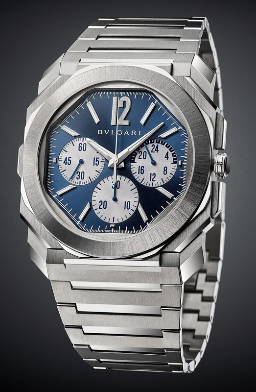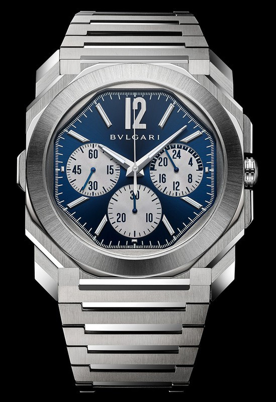 Часы Bvlgari Octo Finissimo S Chronograph GMT представлены в корпусе из нержавеющейстали размером 43 х 8.75 мм и водонепроницаемостью до 100 метров. Внутри корпуса установлен автоматический механизм, Калибр Bulgari BVL 318 с запасом хода 55 часов. На синем с серебристым циферблате отображаются часы, минуты,секунды, GMT, хронограф. Часы комплектуются браслетом из нержавеющей стали.