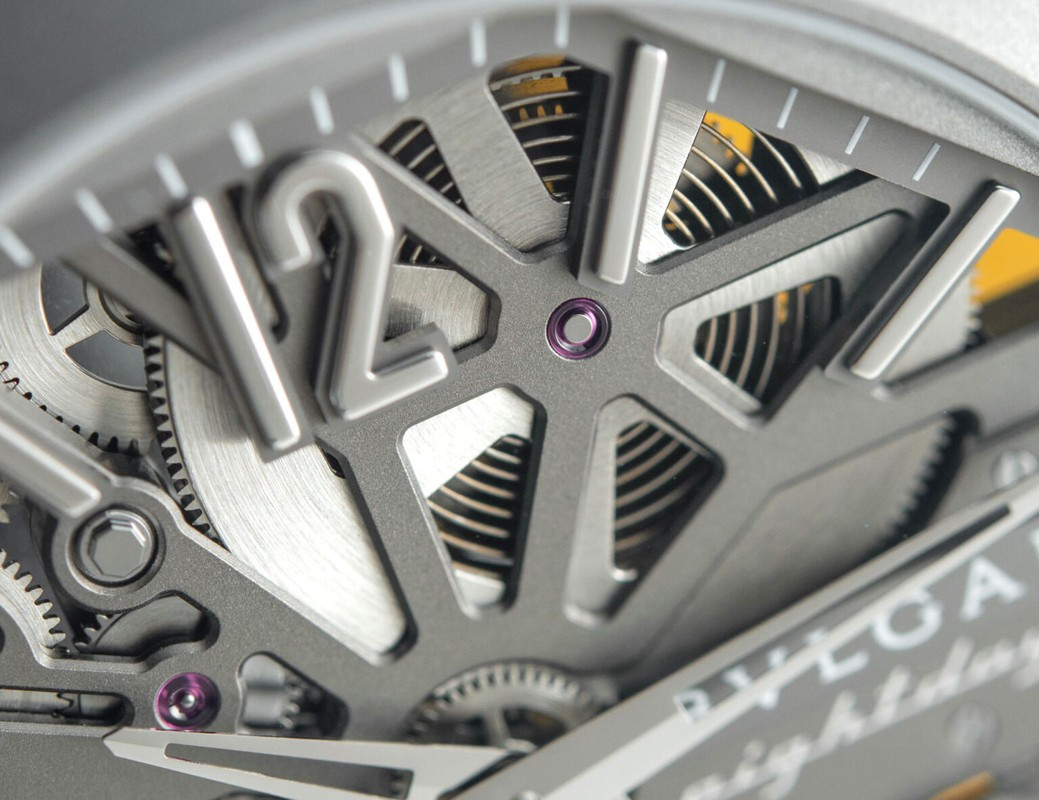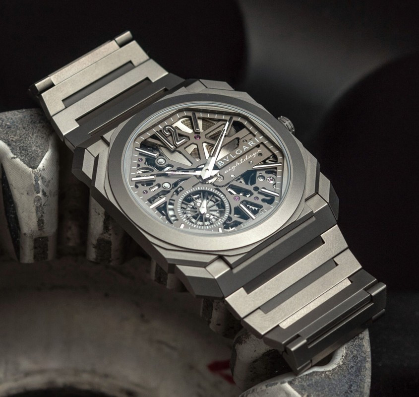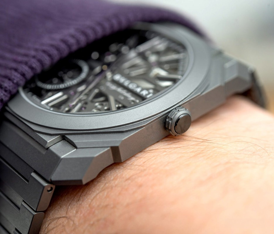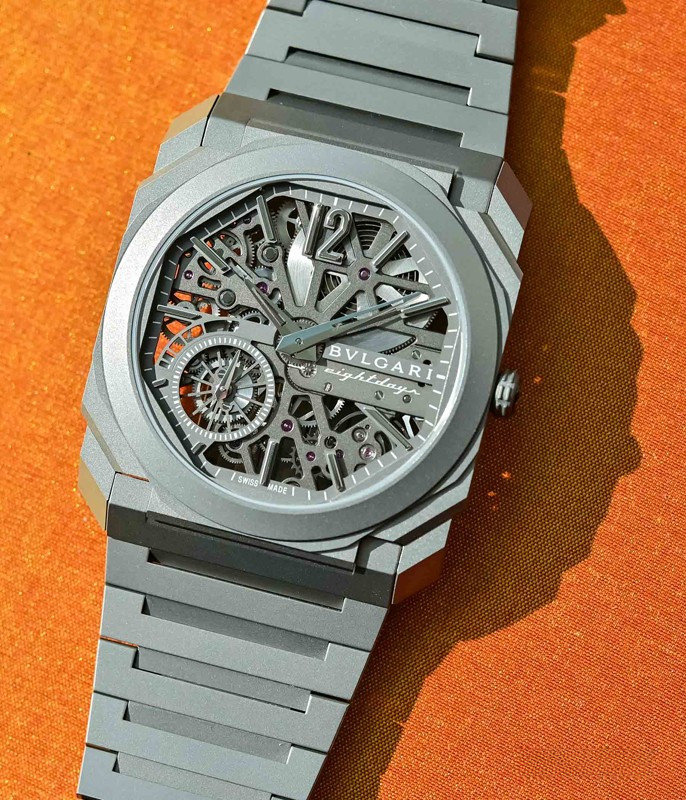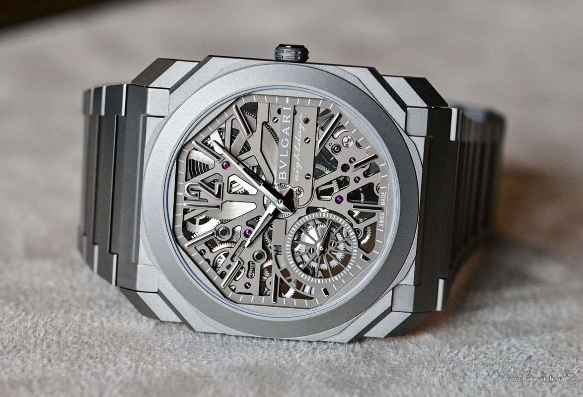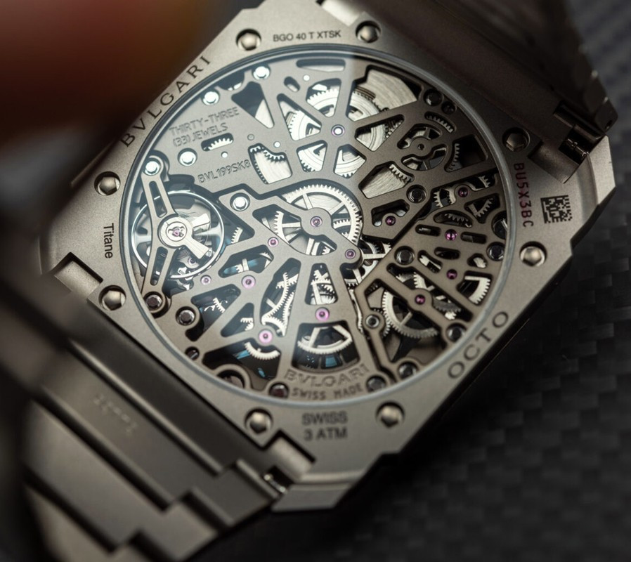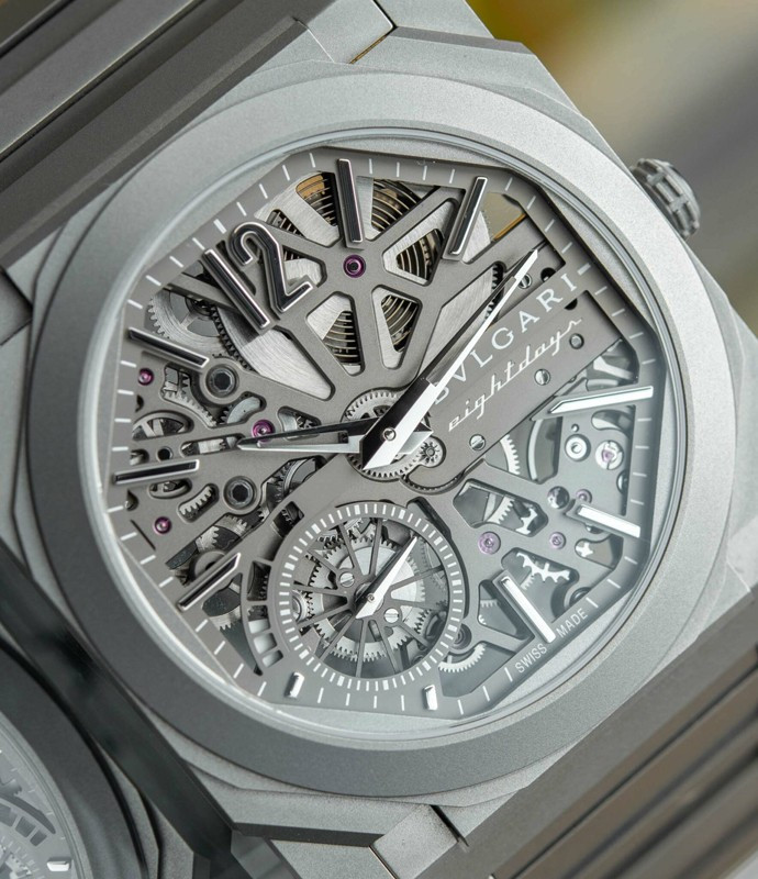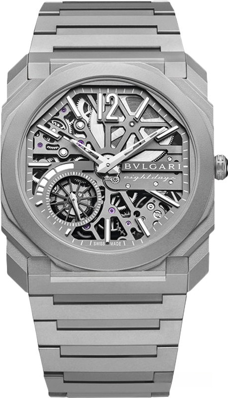 Изысканный контраст прозрачного дизайна и корпуса из титана, позволяющего легко считывать данные превращает часы Octo Finissimo Skeleton 8 Days в истинный объект желания для ценителей часового искусства, которые точно оценят впечатляющий ультратонкий мануфактурный механизм с ручным заводом. Часы, представляющие собой истинный шедевр итальянского дизайна и швейцарского часового мастерства, оснащены 8-дневным запасом хода и титанвымбраслетом. Часы Octo Finissimo Skeleton 8 Days, ультра-тонкий мануфактурный механизм с ручным заводом, калибр BVL 199 SK (толщина 2,50 мм), скелетонированные мосты с антрацитовым покрытием PVD, малая секундная стрелка, запас хода 8 дней (192 часа), частота 21 600 пк/ч (3 Гц). Корпус диаметром 40 мм из титана (5,95 мм), открытая заводная головка, ажурный циферблат с индикатором запаса хода и счетчиком малой секундной стрелки, BVLGARI eight days, логотип, прозрачная задняя крышка, титановый браслет. Водонепроницаемость до 30 метров.