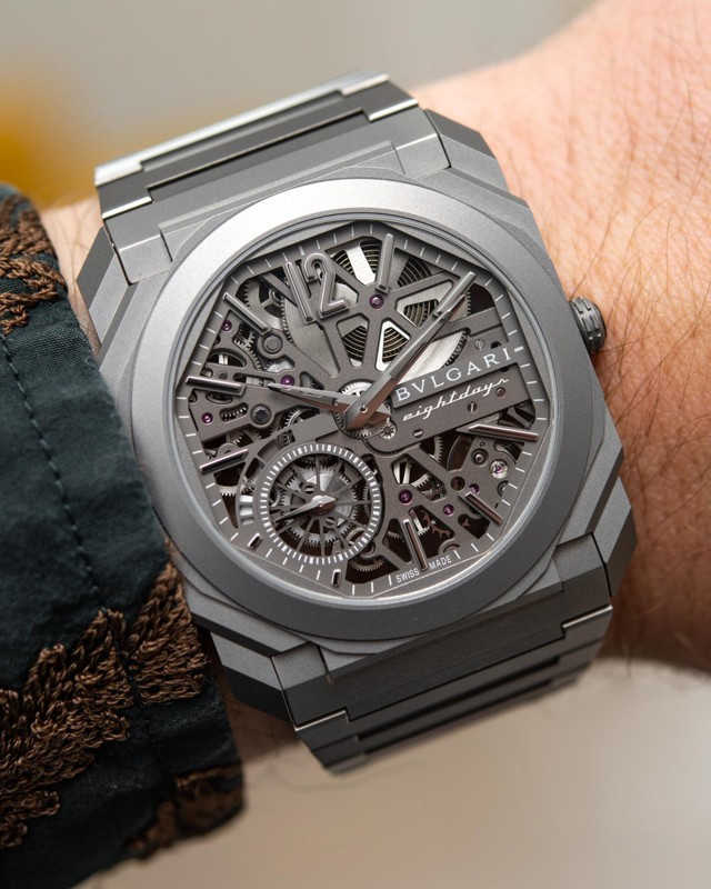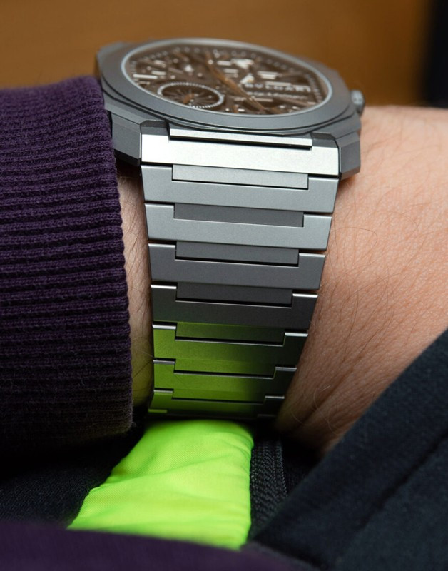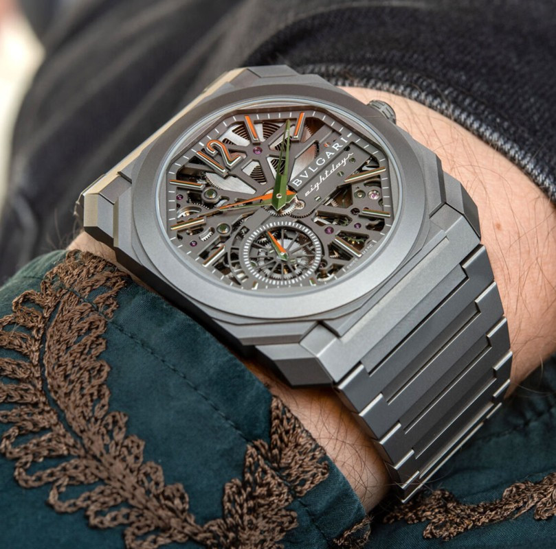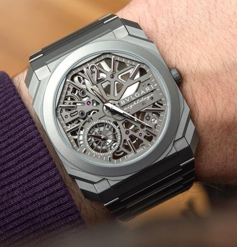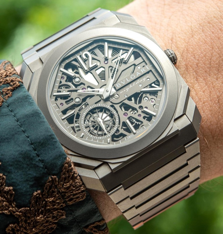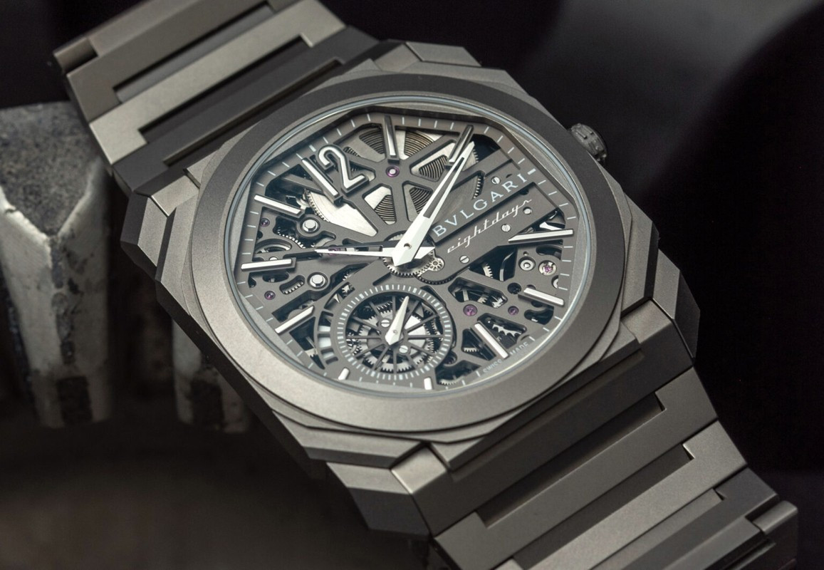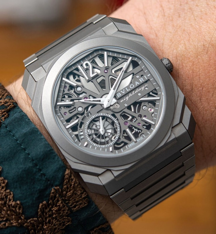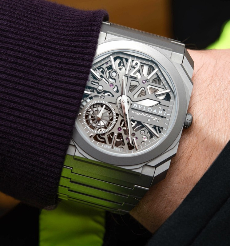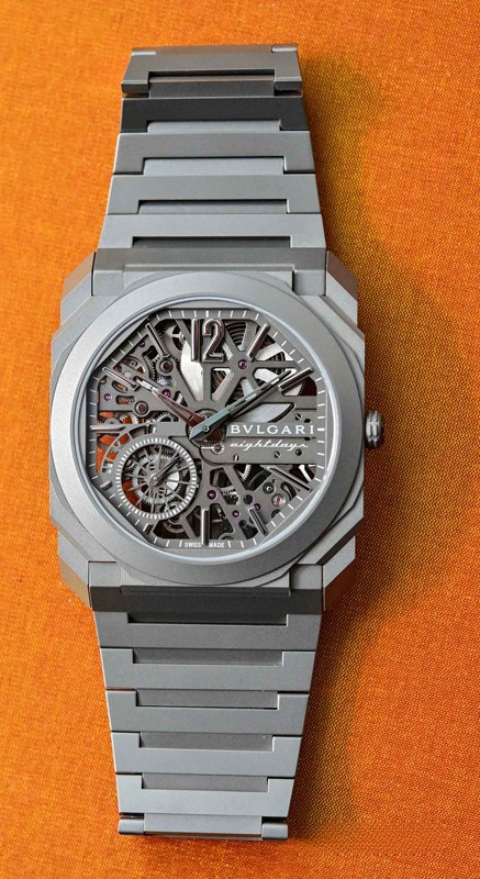 Изысканный контраст прозрачного дизайна и корпуса из титана, позволяющего легко считывать данные превращает часы Octo Finissimo Skeleton 8 Days в истинный объект желания для ценителей часового искусства, которые точно оценят впечатляющий ультратонкий мануфактурный механизм с ручным заводом. Часы, представляющие собой истинный шедевр итальянского дизайна и швейцарского часового мастерства, оснащены 8-дневным запасом хода и титанвымбраслетом. Часы Octo Finissimo Skeleton 8 Days, ультра-тонкий мануфактурный механизм с ручным заводом, калибр BVL 199 SK (толщина 2,50 мм), скелетонированные мосты с антрацитовым покрытием PVD, малая секундная стрелка, запас хода 8 дней (192 часа), частота 21 600 пк/ч (3 Гц). Корпус диаметром 40 мм из титана (5,95 мм), открытая заводная головка, ажурный циферблат с индикатором запаса хода и счетчиком малой секундной стрелки, BVLGARI eight days, логотип, прозрачная задняя крышка, титановый браслет. Водонепроницаемость до 30 метров.