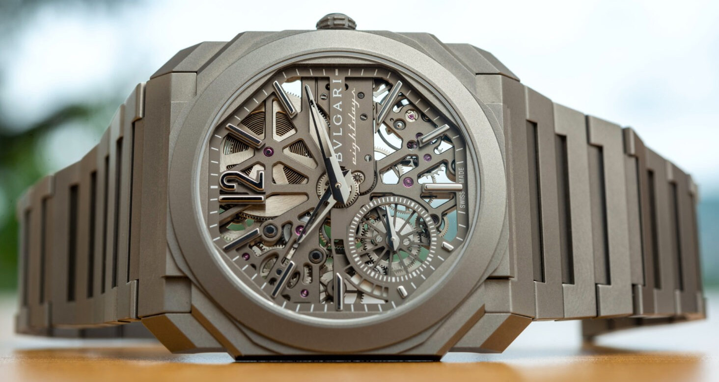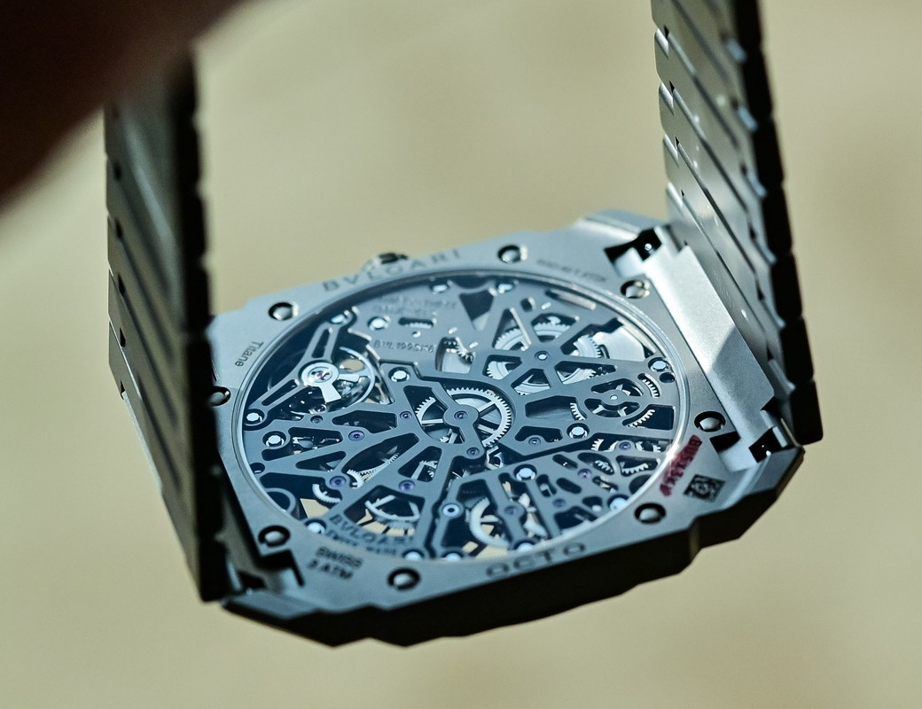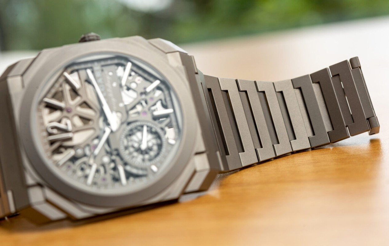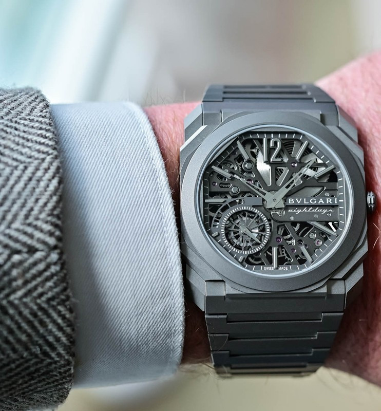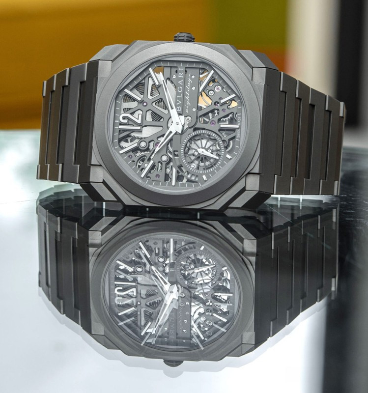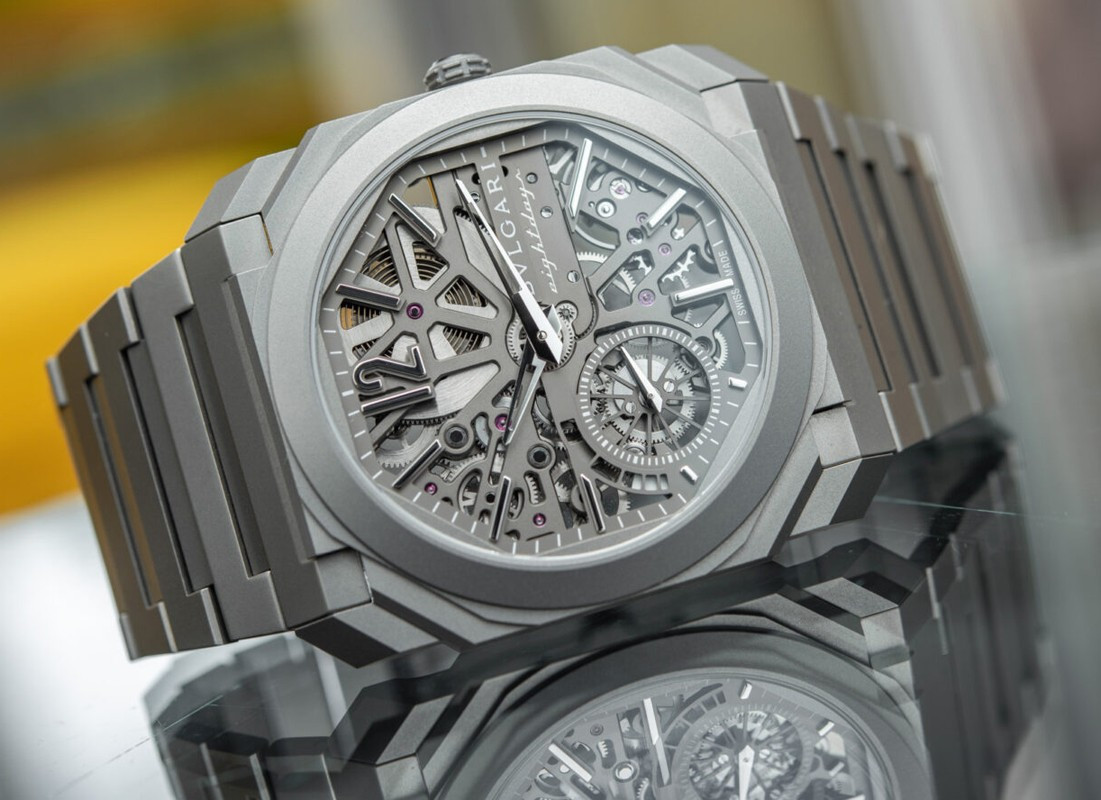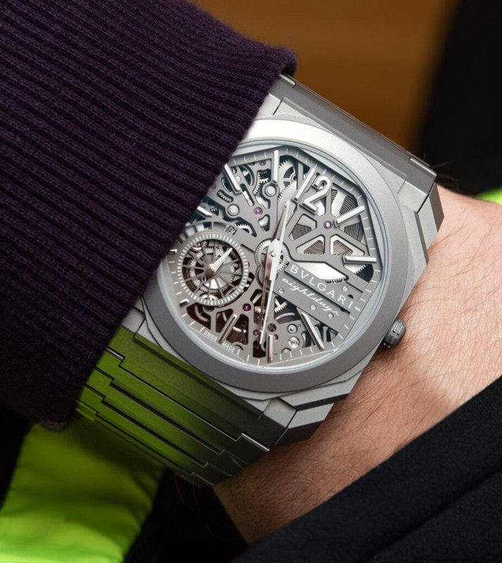 Изысканный контраст прозрачного дизайна и корпуса из титана, позволяющего легко считывать данные превращает часы Octo Finissimo Skeleton 8 Days в истинный объект желания для ценителей часового искусства, которые точно оценят впечатляющий ультратонкий мануфактурный механизм с ручным заводом. Часы, представляющие собой истинный шедевр итальянского дизайна и швейцарского часового мастерства, оснащены 8-дневным запасом хода и титанвымбраслетом. Часы Octo Finissimo Skeleton 8 Days, ультра-тонкий мануфактурный механизм с ручным заводом, калибр BVL 199 SK (толщина 2,50 мм), скелетонированные мосты с антрацитовым покрытием PVD, малая секундная стрелка, запас хода 8 дней (192 часа), частота 21 600 пк/ч (3 Гц). Корпус диаметром 40 мм из титана (5,95 мм), открытая заводная головка, ажурный циферблат с индикатором запаса хода и счетчиком малой секундной стрелки, BVLGARI eight days, логотип, прозрачная задняя крышка, титановый браслет. Водонепроницаемость до 30 метров.