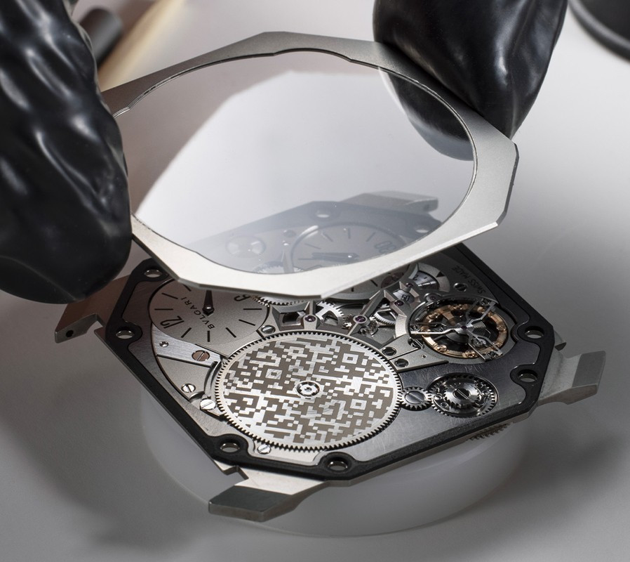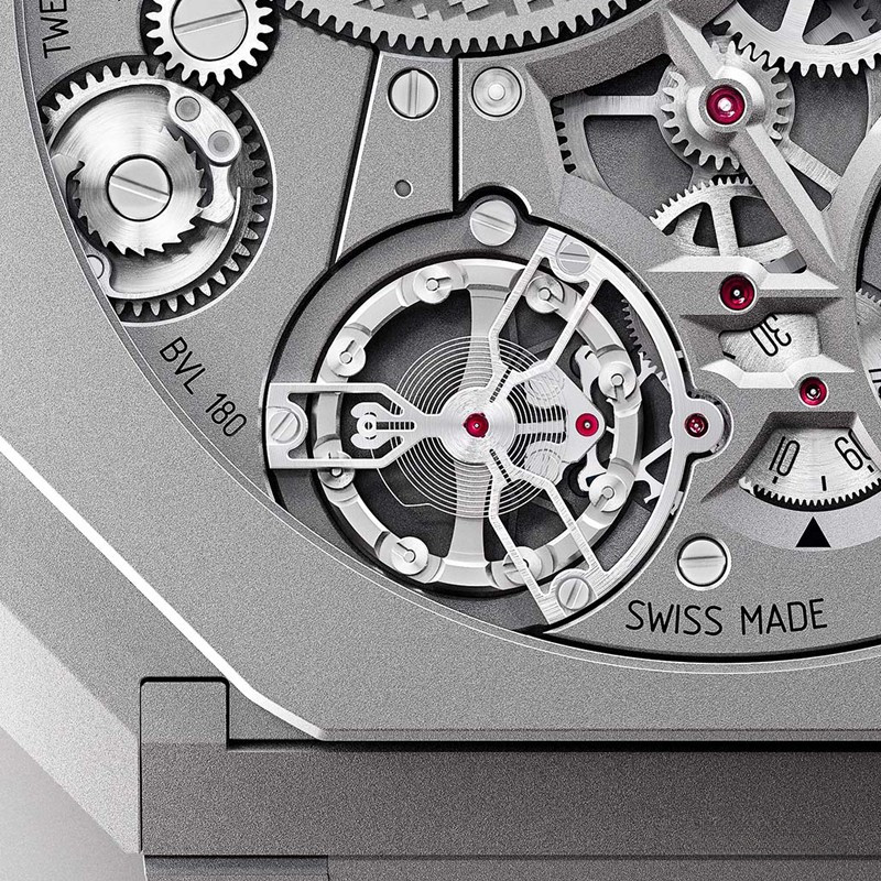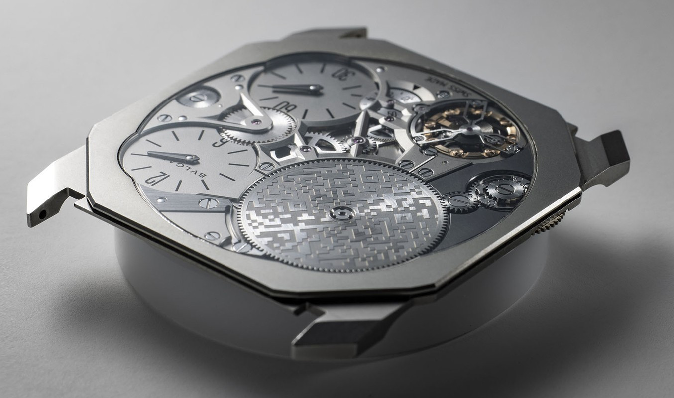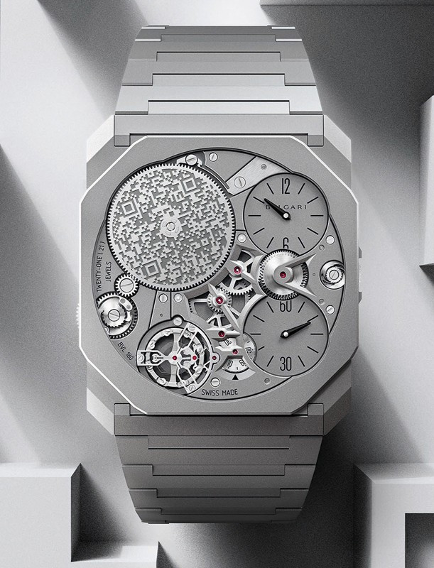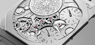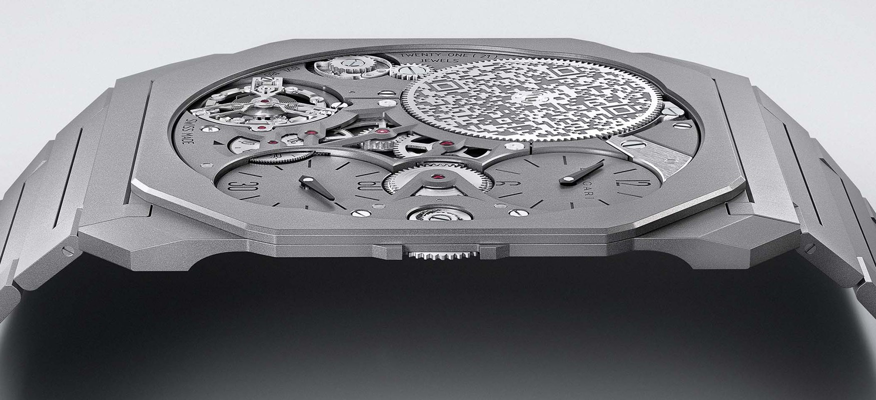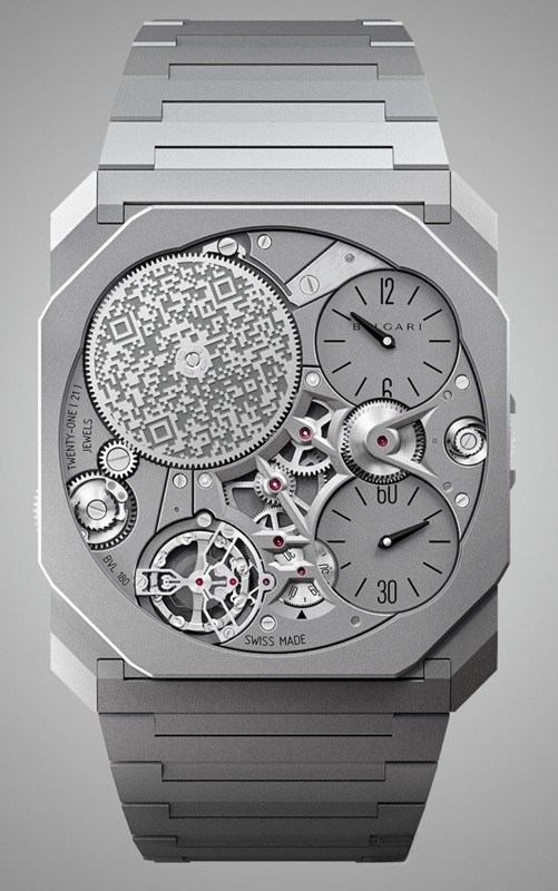 Часы Bvlgari Octo Finissimo Ultra представлены в корпусе из титана размером 40 х 1.8 мм водонепроницаемостью 10 метров. Внутри корпуса установлен механизм с ручным заводом, Калибр BVL 180, обладающий запасом хода 50 часов. На серебристом циферблате отображаются часы, минуты, секунды. Часы поставляются на титановом браслете. Серия огрничена - 10 шт.