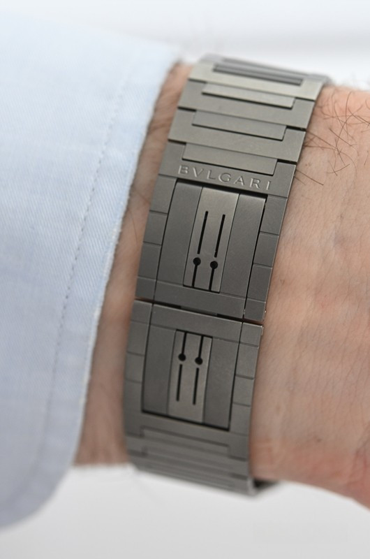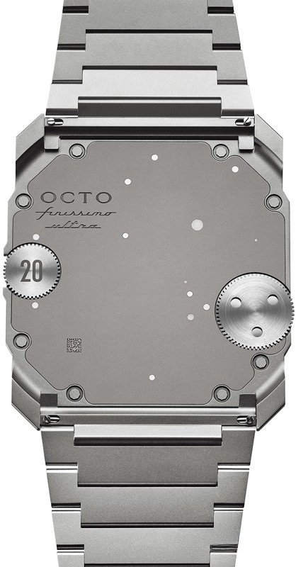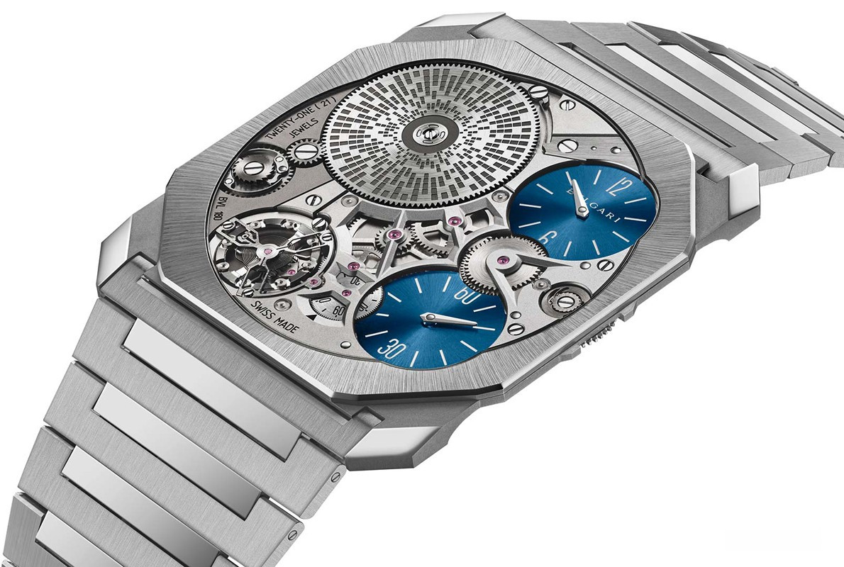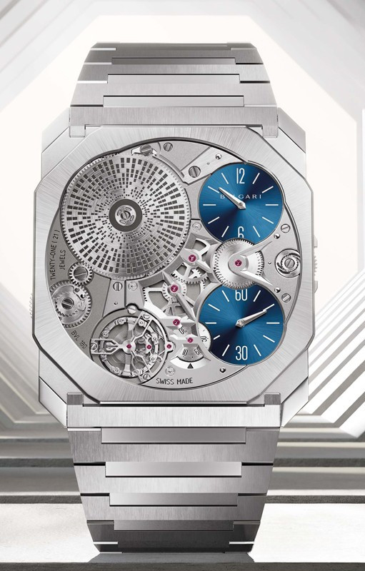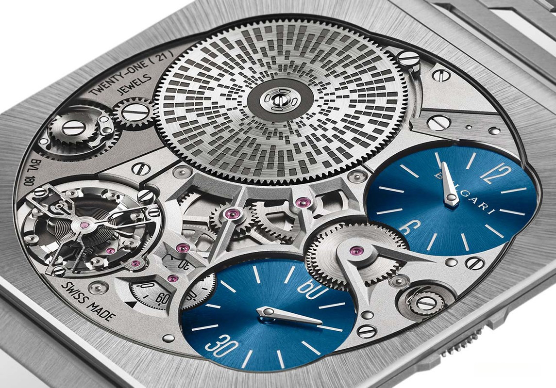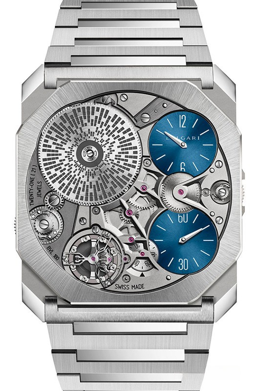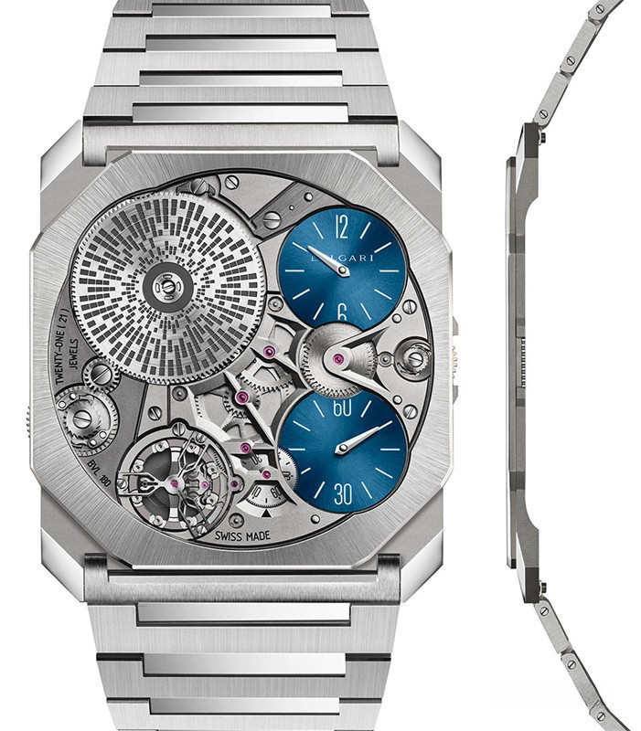 Часы Bvlgari Octo Finissimo Ultra представлены в корпусе из платины 950 размером 40 х 1.8 мм водонепроницаемостью 10 метров. Внутри корпуса установлен механизм с ручным заводом, Калибр BVL 180, обладающий запасом хода 50 часов. На синем циферблате отображаются часы, минуты, секунды. Часы поставляются на платиновом браслете. Серия огрничена - 20 шт.
