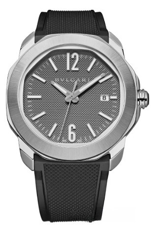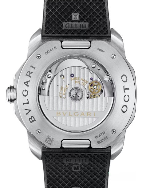 Часы Bvlgari Octo Roma представлены в корпусе размером 41 мм нержавеющей стали водонепроницаемостью 100 метров. Внутри корпуса установлен автоматический механизм, Калибр BVL 191, обладающий запасом хода 42 часа. На сером циферблате отображаются часы, минуты, секунды, дата. Часы поставляются на каучуковом ремешке с застежкой из нержавеющей стали.