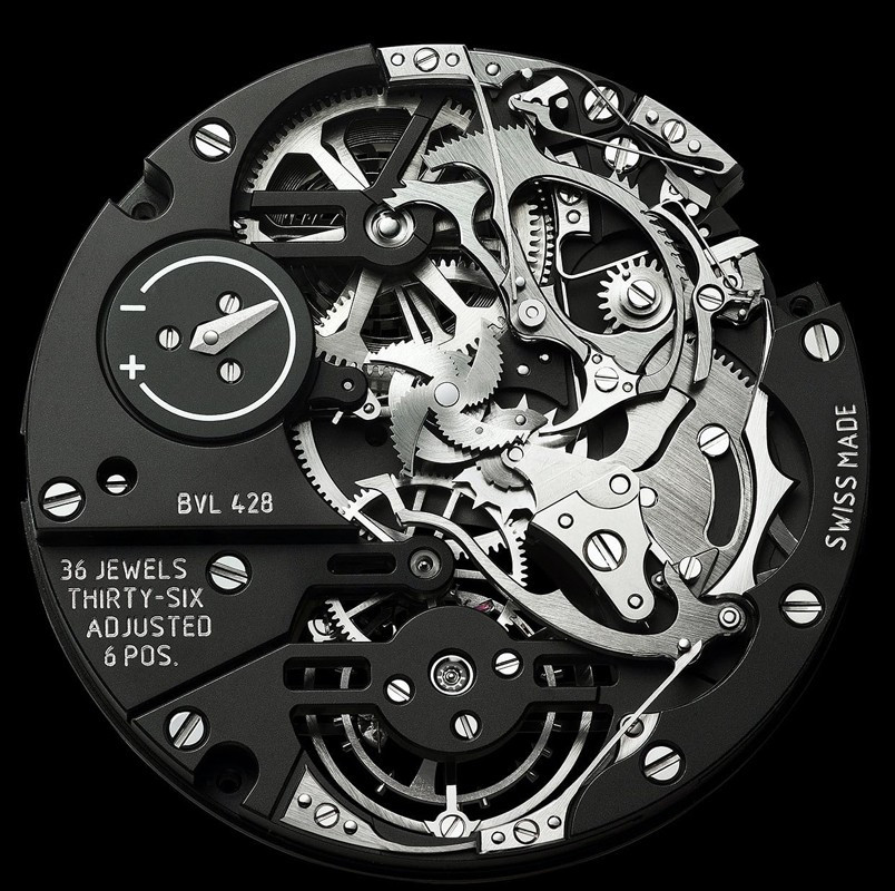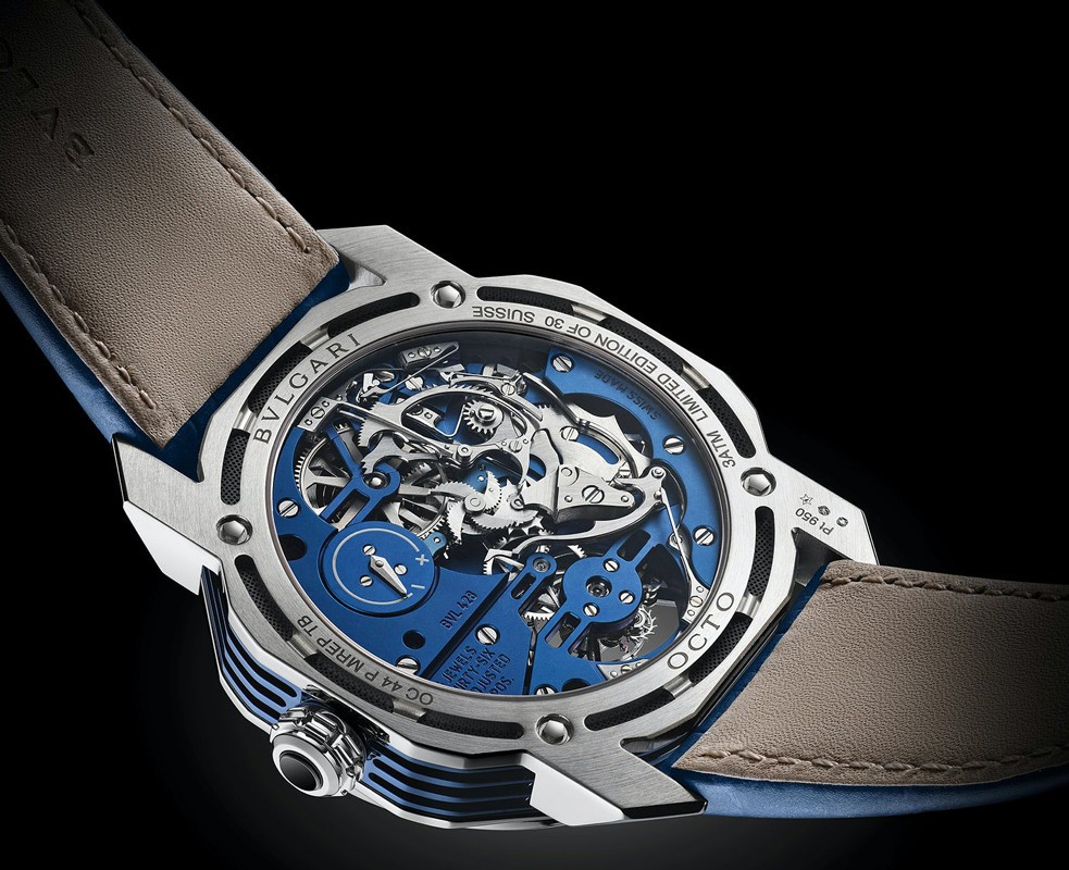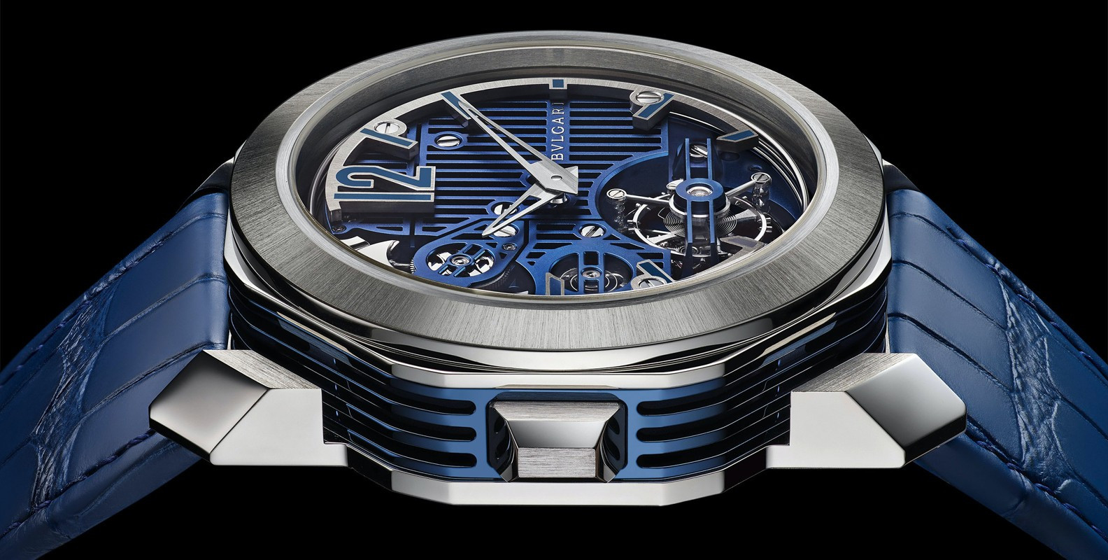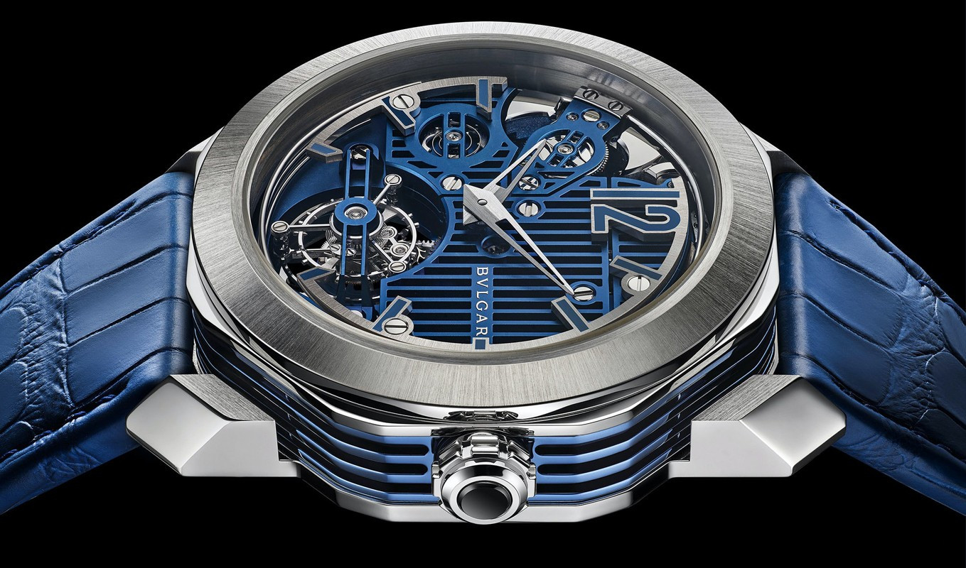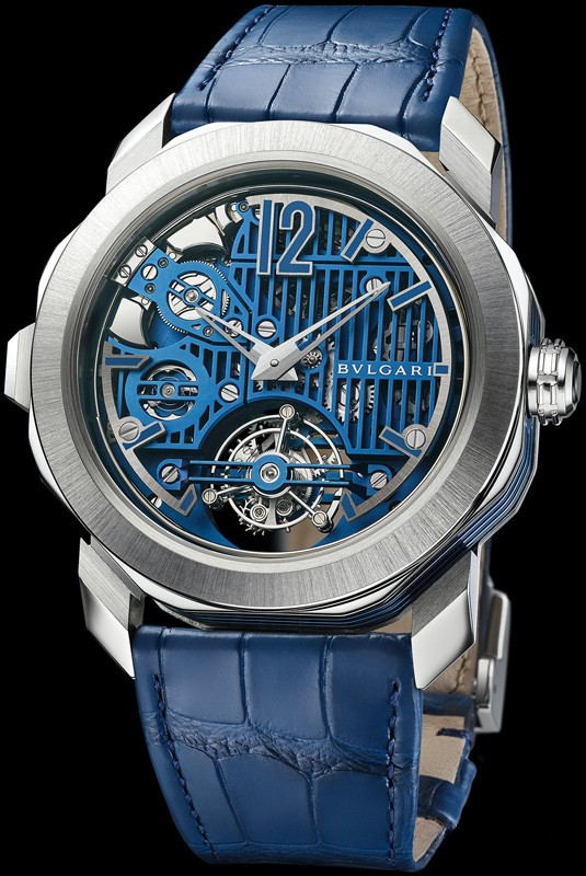 Часы Bvlgari Octo Roma Blue Carillon Tourbillon представлены в корпусе размером 44 х 12.83 мм из платины 950 водонепроницаемостью 30 метров. Внутри корпуса установлен механизм с ручным заводом, Калибр BVL428, обладающий запасом хода 75 часов. На синем циферблате отображаются часы, минуты, турбийон. Часы поставляются на ремешке из кожи аллигатора с платиновой застежкой. Серия ограничена - 30 шт.