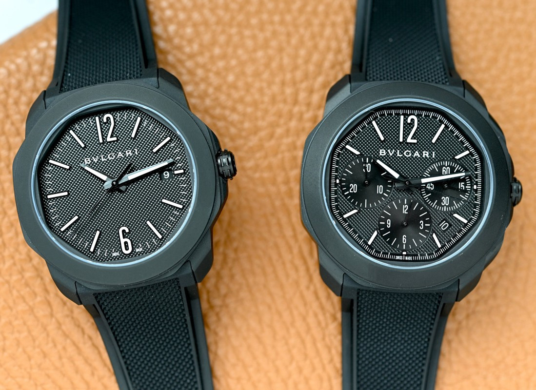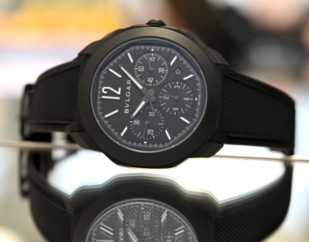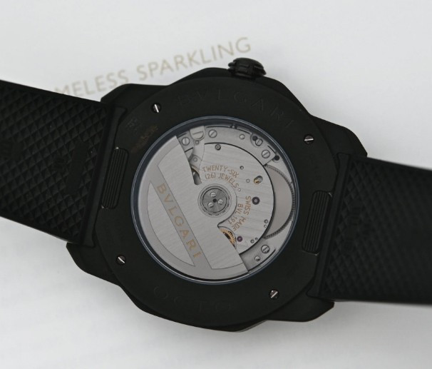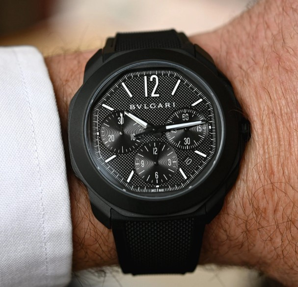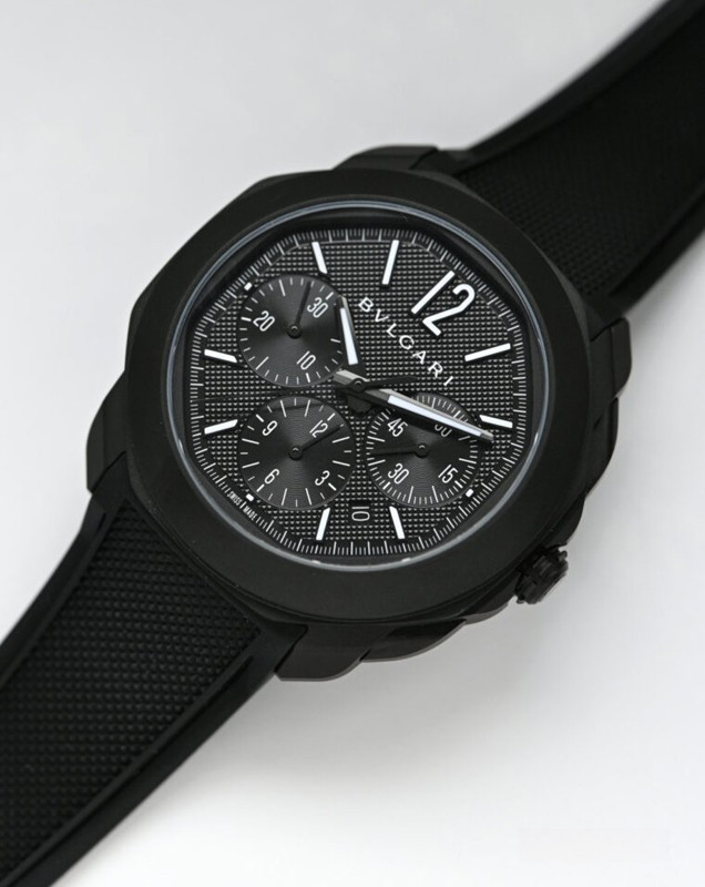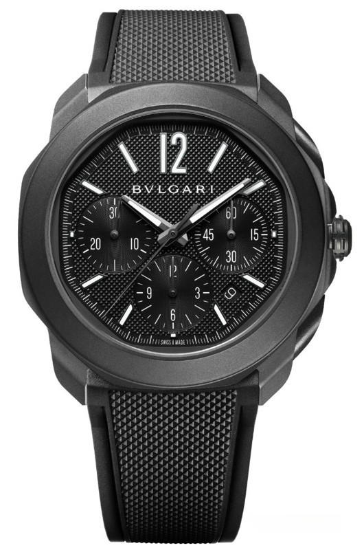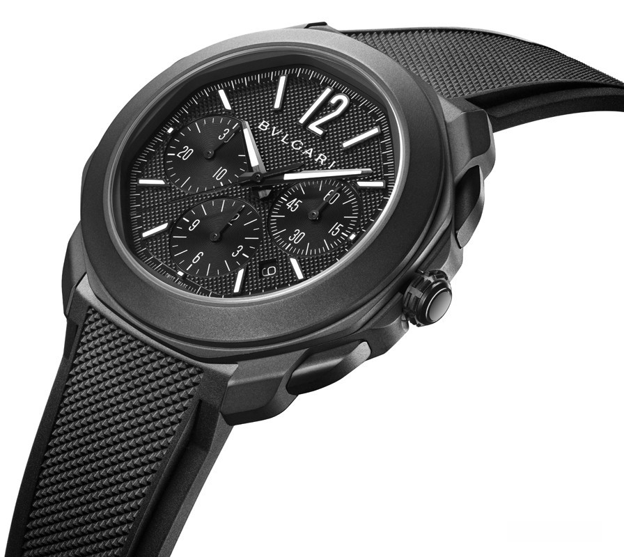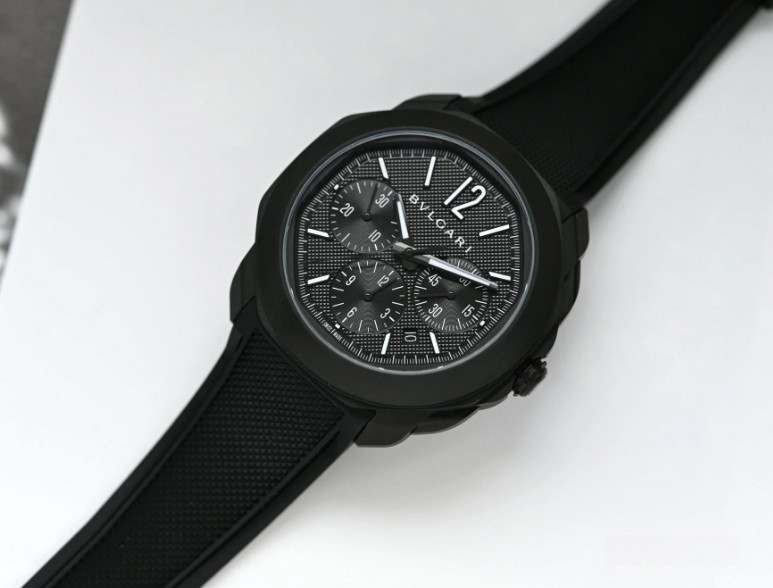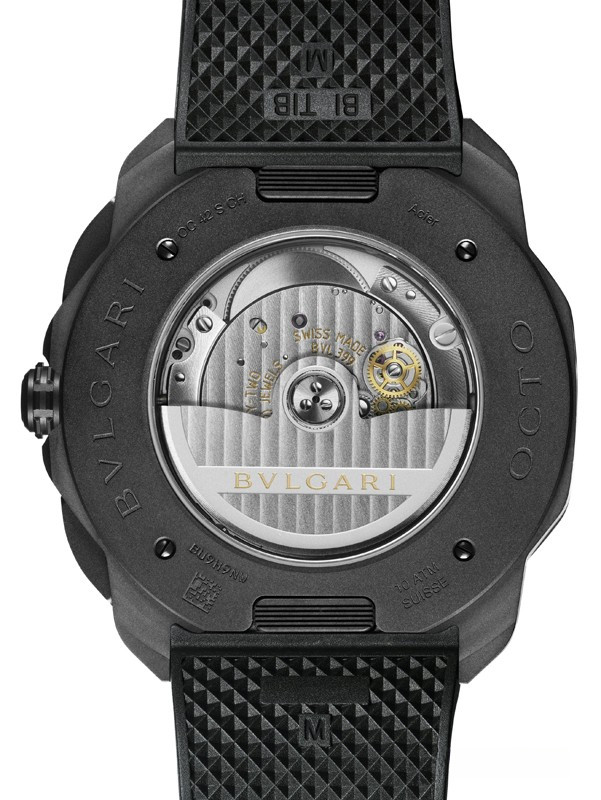 Часы Bvlgari Octo Roma Chronograph представлены в корпусе размером 42 мм нержавеющей стали с покрытием DLC водонепроницаемостью 100 метров. Внутри корпуса установлен автоматический механизм, Калибр BVL 399, обладающий запасом хода 42 часа. На черном гильошированном циферблате отображаются часы, минуты, секунды, дата. Часы поставляются на каучуковом ремешке с застежкой из нержавеющей стали.