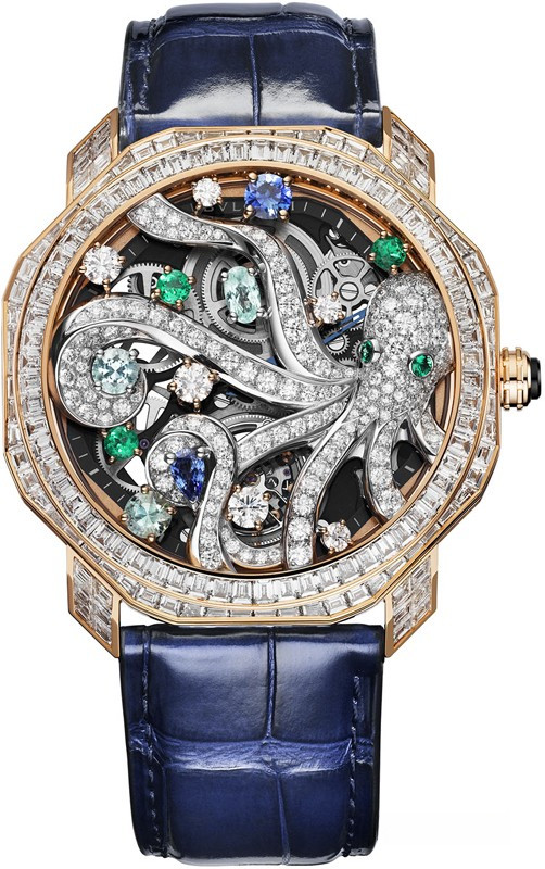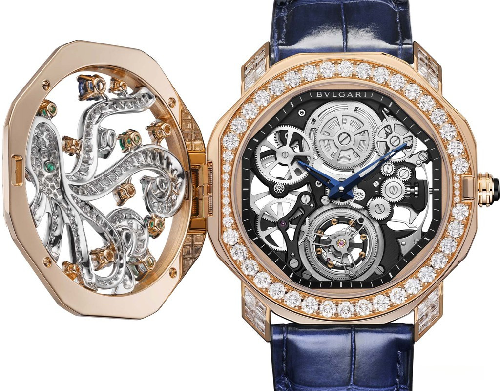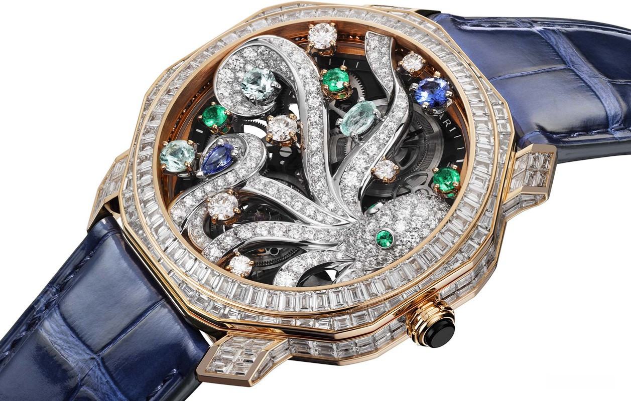 Часы Bvlgari Octo Roma Mediterranea представлены в корпусе размером 44 мм из розового золота 18к водонепроницаемостью 30 метров. Внутри корпуса установлен механизм с ручным заводом, Калибр BVL268 SK, обладающий запасом хода 52 часа. На циферблате с белыми бриллиантами отображаются часы, минуты, турбийон. Часы поставляются на ремешке из кожи аллигатора с золотой застежкой. Корпус инкрустирован белыми бриллиантами. Серия ограничена - 1 шт.