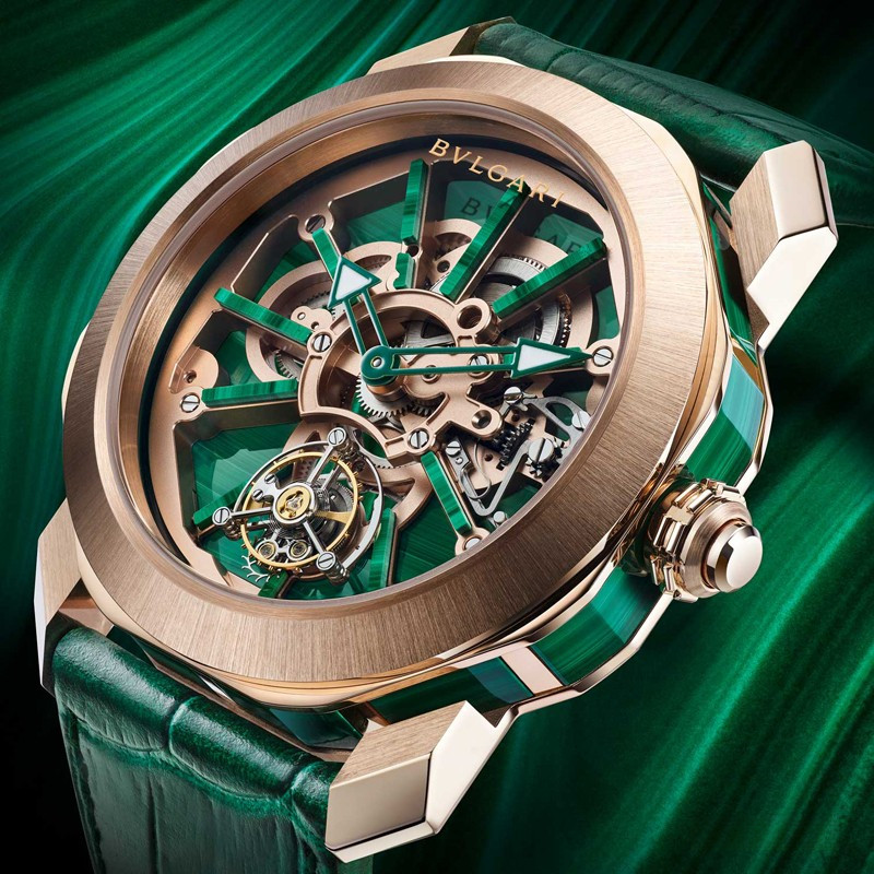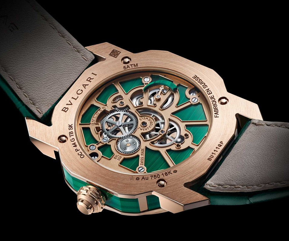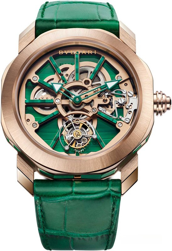 Часы Bvlgari Octo Roma Naturalia представленыв корпусе из розового золота 18к диаметром 44 мм водонепроницаемостью 30 метров. Внутри корпуса установлен механизм с ручным заводом, Калибр BVL 206, с турбийоном. На зеленом малахитовом циферблате отображаются часы и минуты. Часы поставляются на ремешке из кожи аллигатора с вставкой из розового золота 18к.