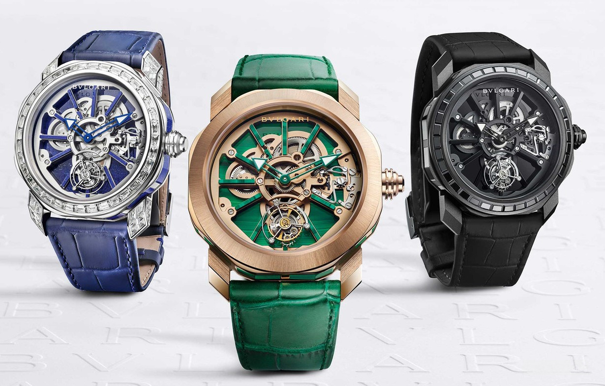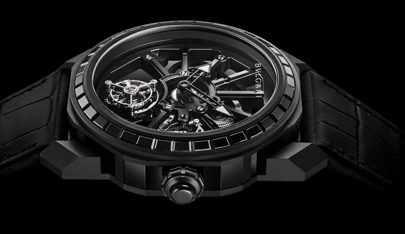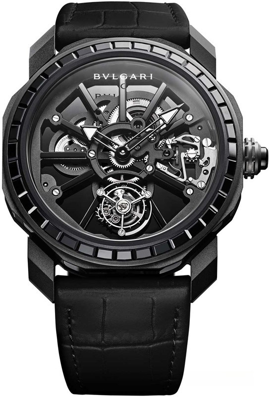 Часы Bvlgari Octo Roma Naturalia представленыв корпусе из титана с покрытием DLC диаметром 44 мм водонепроницаемостью 30 метров. Внутри корпуса установлен механизм с ручным заводом, Калибр BVL 206, с турбийоном. На черном скелетированном циферблате отображаются часы и минуты. Часы поставляются на ремешке из кожи аллигатора с титановой вставкой. Безель из черного багетного оникса.