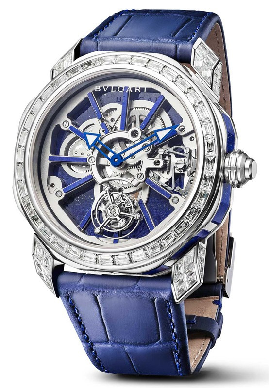 Часы Bvlgari Octo Roma Naturalia представленыв корпусе из платины 950 диаметром 44 мм водонепроницаемостью 30 метров. Внутри корпуса установлен механизм с ручным заводом, Калибр BVL 206, с турбийоном. На синем циферблате отображаются часы и минуты. Часы поставляются на ремешке из кожи аллигатора с вставкой из платины 950. Корпус инкрустирован белыми багетными бриллиантами.