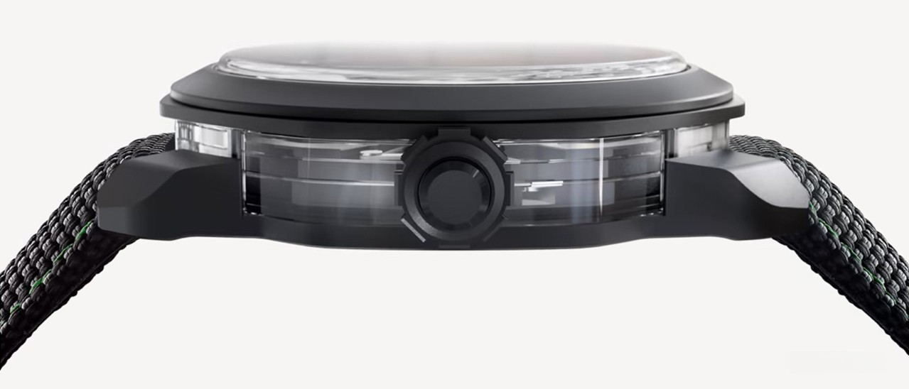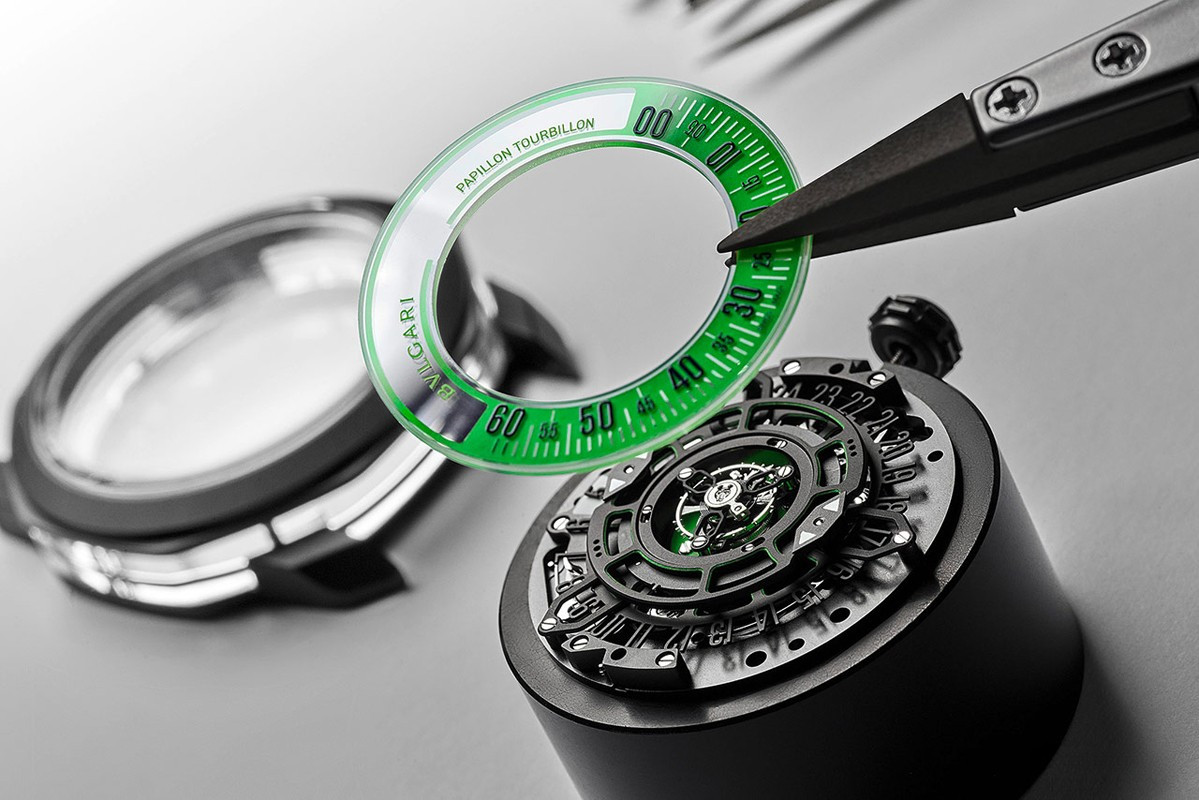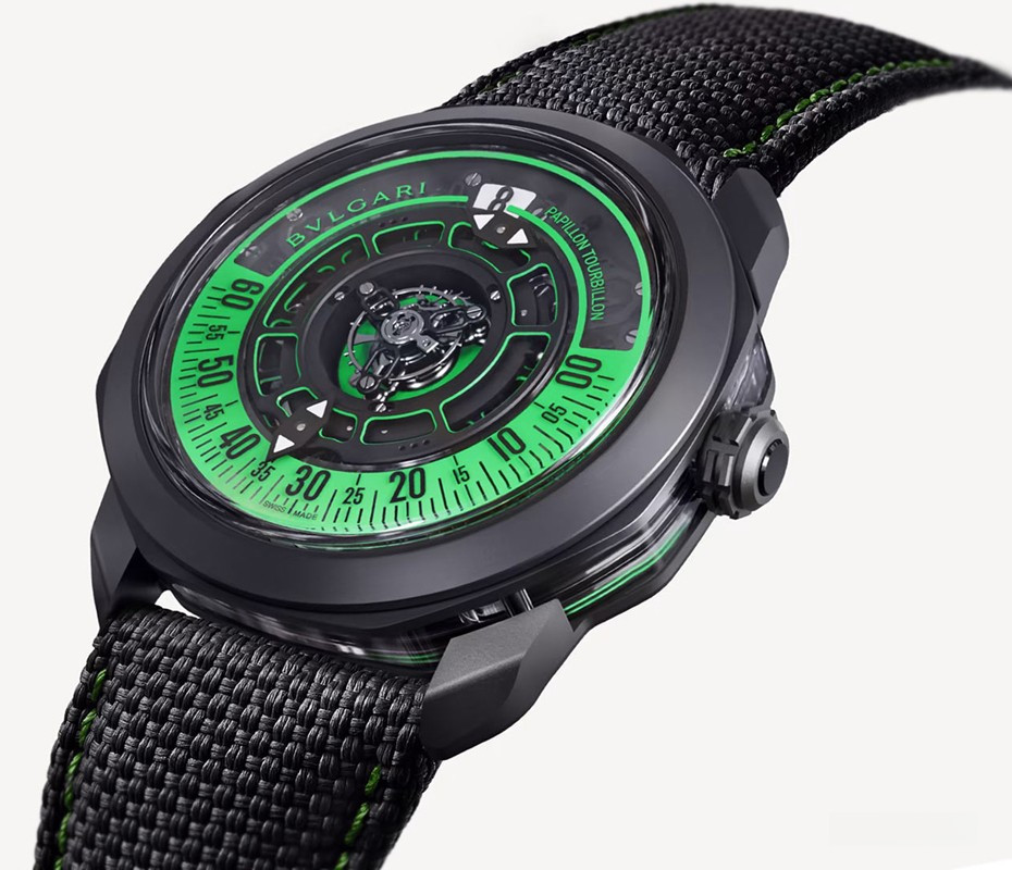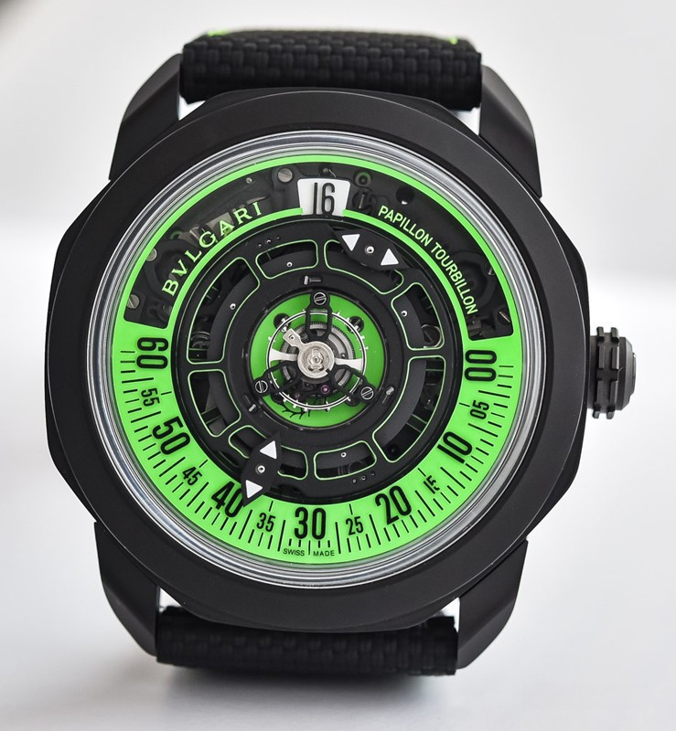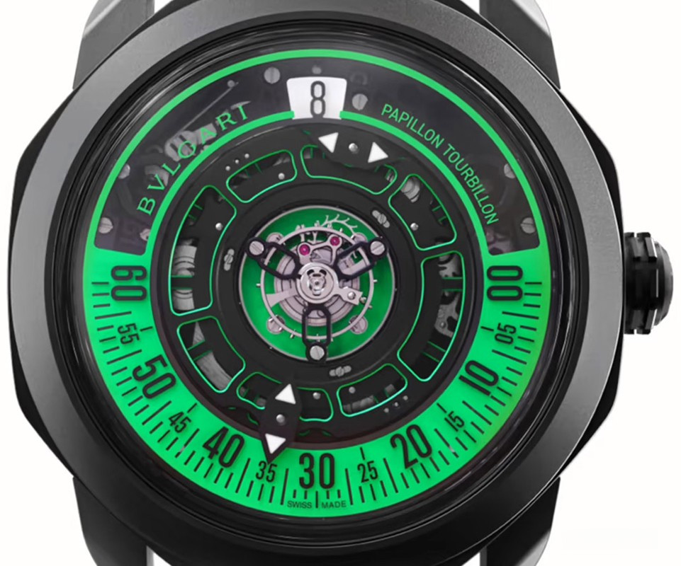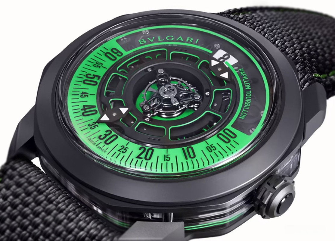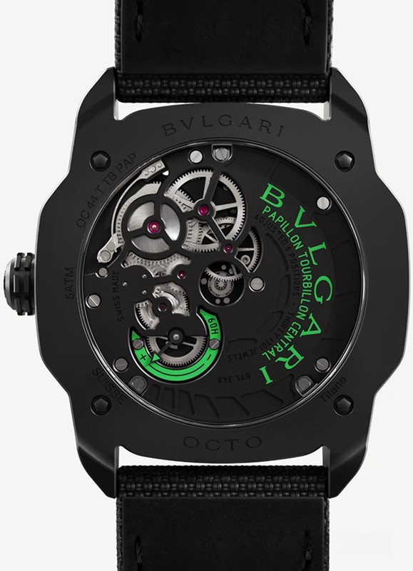 Часы Bvlgari Octo Roma Striking Papillon Tourbillon представлены в корпусе размером 44 х 11.9 мм из титана с покрытием DLC водонепроницаемостью 50 метров. Внутри корпуса установлен механизм с ручным заводом, Калибр BVL 332, обладающий запасом хода 60 часов. На черном с зеленым циферблате отображаются часы, минуты, секунды, турбийон. Индиктаор запаса хода расположен с обратной стороны корпуса. Часы поставляются на текстильном ремешке с титановой застежкой.