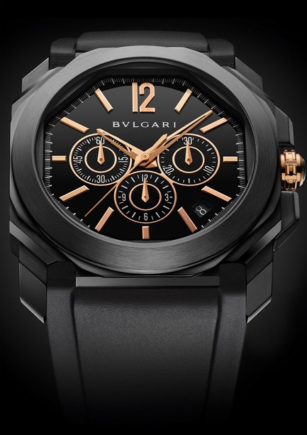 Модель Octo Velocissimo Ultranero от производителя швейцарских часов Bvlgari имеет корпус, выполненный в октогональной форме, изготовленный из нержавеющей стали с черным покрытием, диаметром 41,0 мм. Защищенная шаровидная заводная головка, выполненная из 18-каратного розового золота, расположена на 3 часах, продолговатые пушеры хронографа - на 2 и 4 часах. Сапфировое стекло установлено на передней стороне часового корпуса и на его завинчивающейся задней крышке. Циферблат черного цвета, с накладными золотыми арабскими цифрами, часовыми индексами и стрелками (в том числе часовая и минутная стрелки - скелетонизированные). Модель оснащена швейцарским автоматическим механизмом El Primero от Zenith, с балансовой частотой 36000 полуколебаний в час (5 гц), с функциями индикации часов, минут (посредством соответствующих центральных стрелок), секунд (на соответствующем малом боковом циферблате, расположенном на 9 часах), даты (посредством соответствующего цифрового указателя в апертуре, расположенной между 4 и 5 часами), а также с хронографом (центральная секундная стрелка, круглый аналоговый 30-минутный счетчик, расположенный на 3 часах и круглый аналоговый 12-часовый счетчик, расположенный на 6 часах). Поставляется на черном каучуковом ремешке.