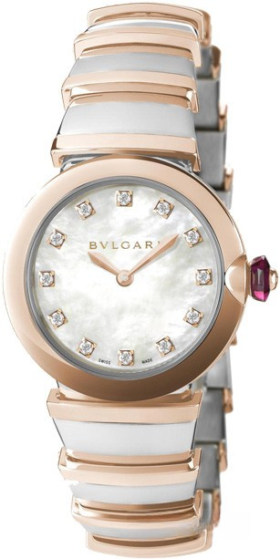 Часы Bvlgari Lvcea представлены в корпусе из розового золота 18к и нержавеющей стали размером 28 мм и водонепроницаемостью 30 метров. Внутри корпуса установлен кварцевый механизм. На белом жемчужном циферблате с 12-ю белыми бриллиантами отображаются часы, минуты, секунды, дата. Часы поставляются на браслете из розового золота 18к и нержавеющей стали.
