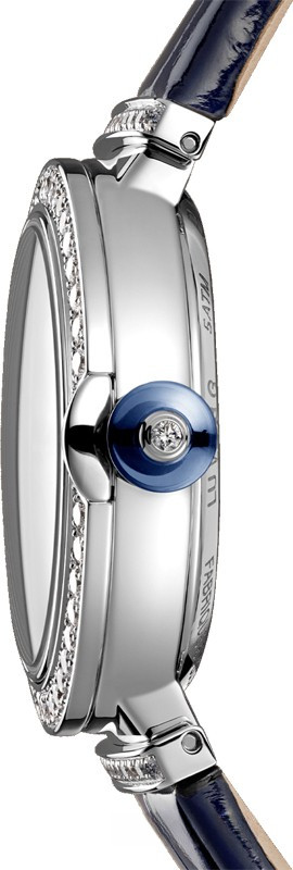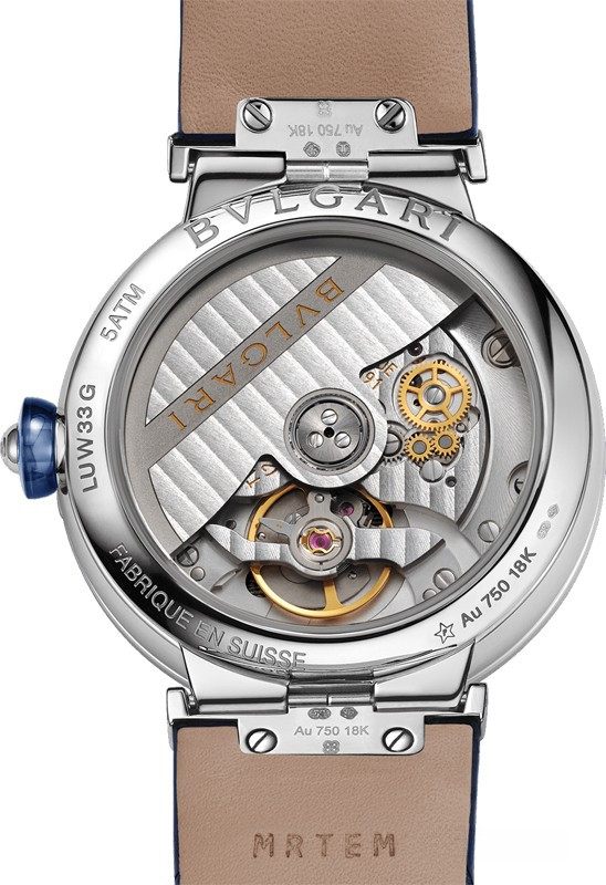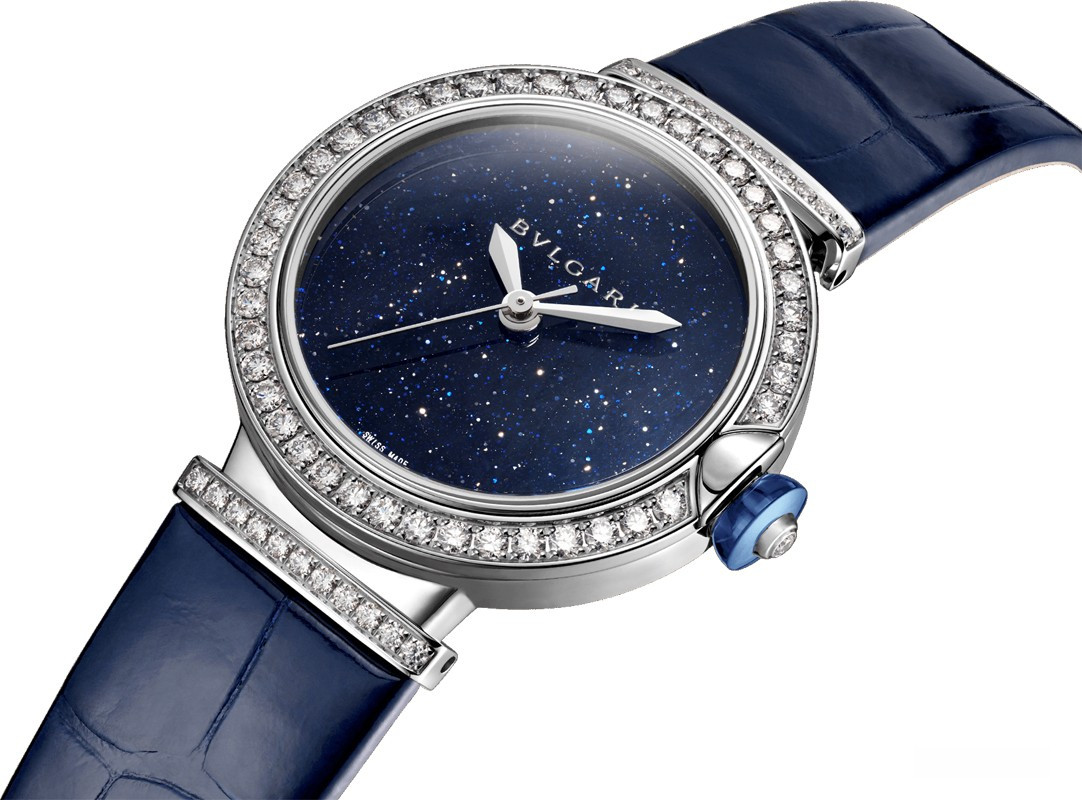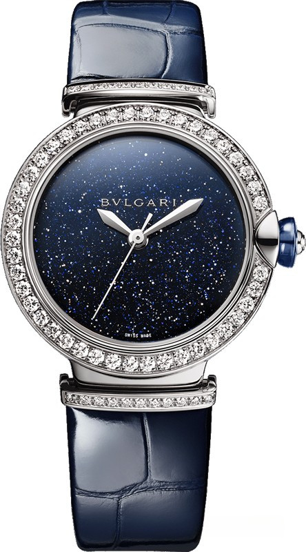 Часы Bvlgari Lvcea представлены в корпусе из белого золота 18к размером 33 мм и водонепроницаемостью 50 метров. Внутри корпуса установлен автоматический механизм. На синем авантюриновом циферблате отображаются часы, минуты, секунды. Часы поставляются на ремешке из кожи аллигатора с вставкой из белого золота 18к. Корпус инкрустирован белыми бриллиантами.